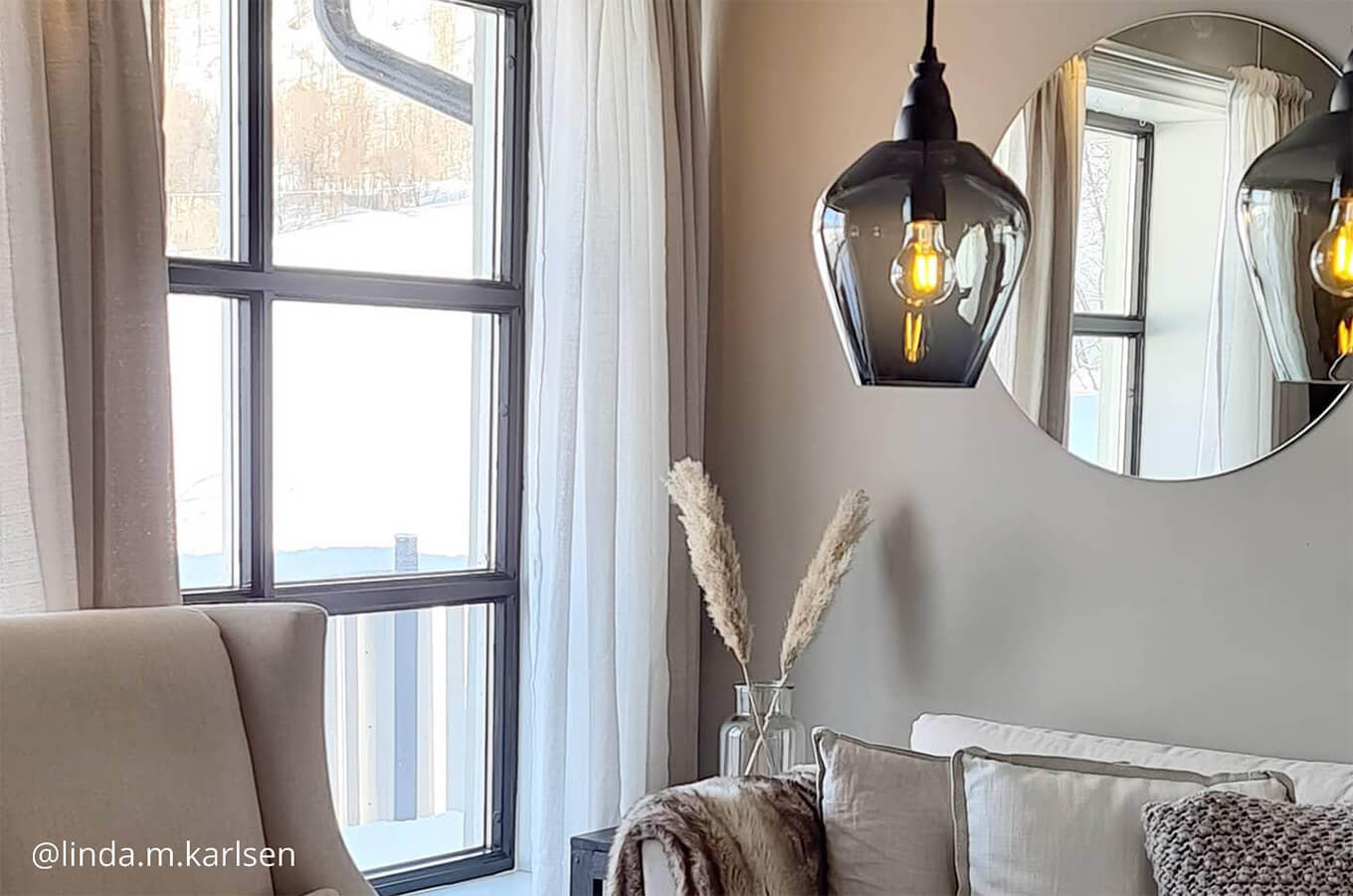 Miroir rond sur mur gris