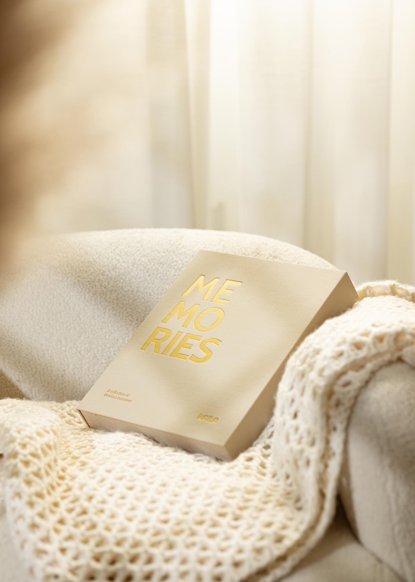 L'album est élégamment habillé de textile de couleur crème, et sur le devant et le dos de l'album se trouve un imprimé doré avec le texte "MEMORIES". Le titre de l'album est aussi complété par le sous-titre "A collection of timeless treasures", imprimé dans le coin inférieur gauche.