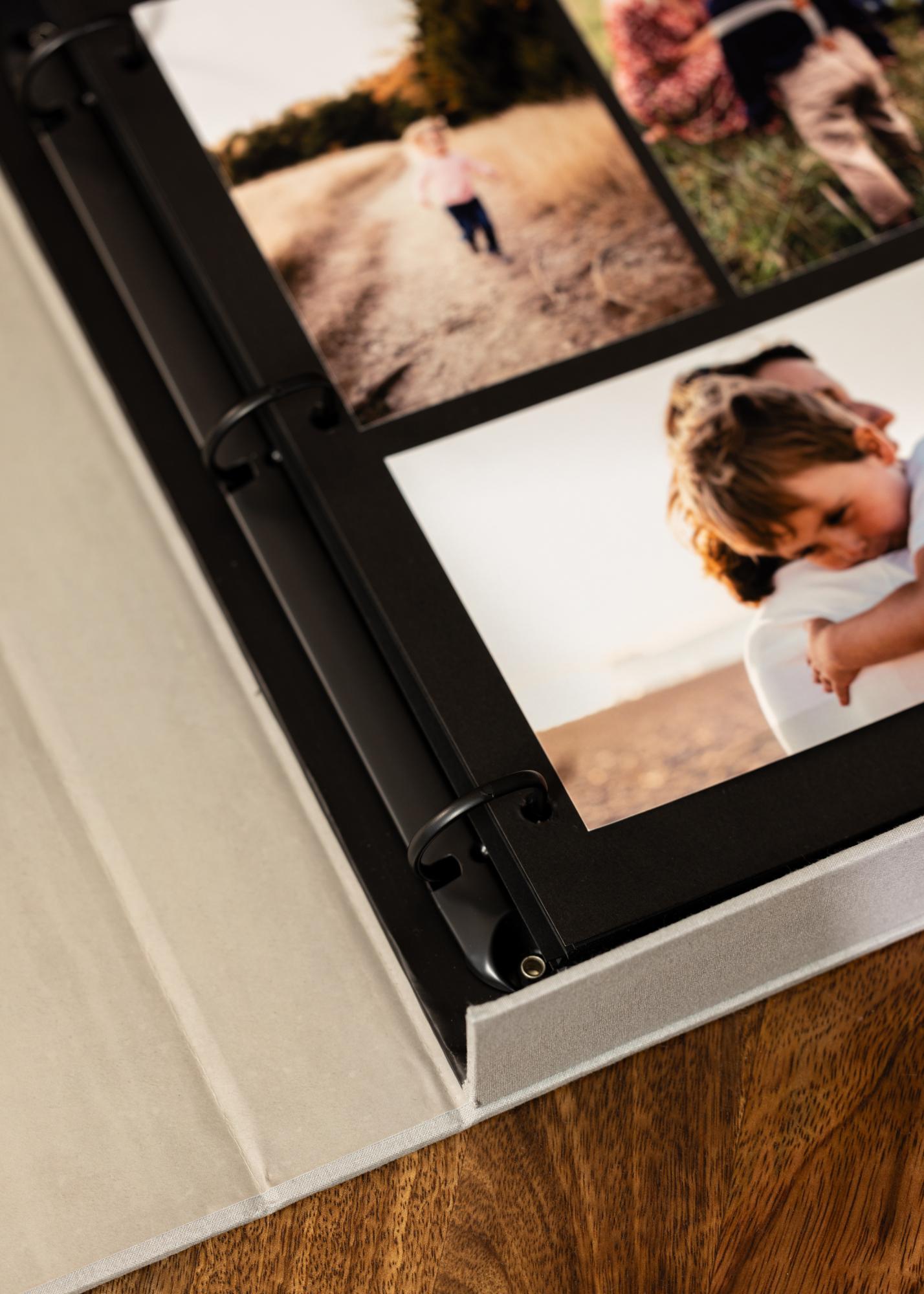 L'album photo est conçu comme une boîte exclusive que vous ouvrez pour accéder au contenu. À l'intérieur de l'album, vous rencontrez un classeur à anneaux et 30 feuilles noires (60 pages) à remplir de vos souvenirs préférés. Vous collez vous-même vos photos, ce qui vous offre beaucoup de flexibilité et la possibilité de révéler votre côté créatif.