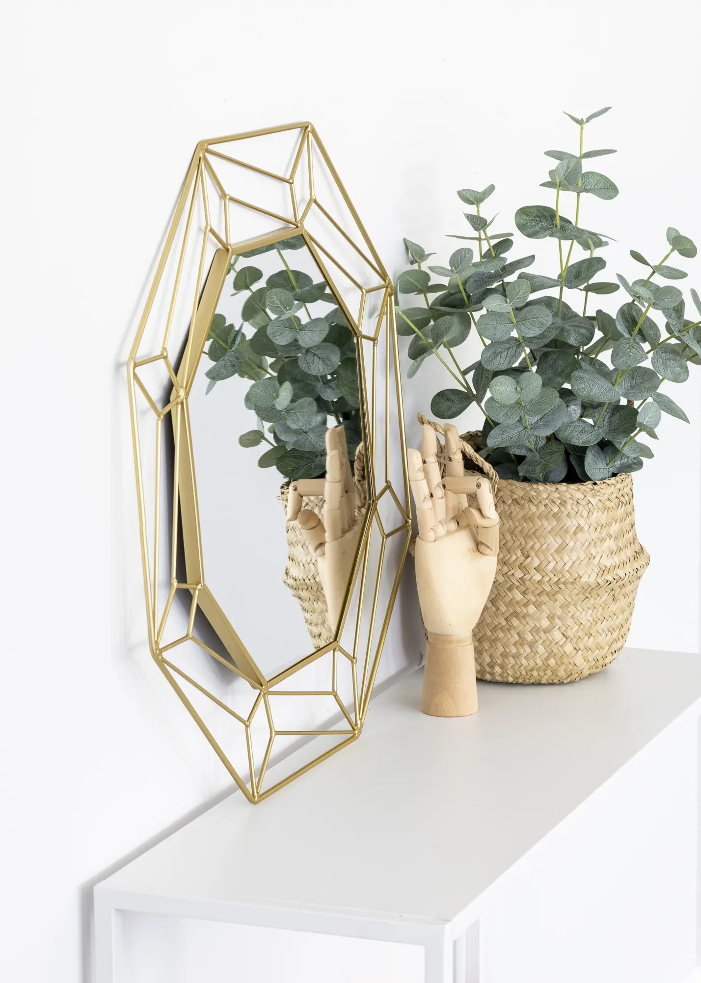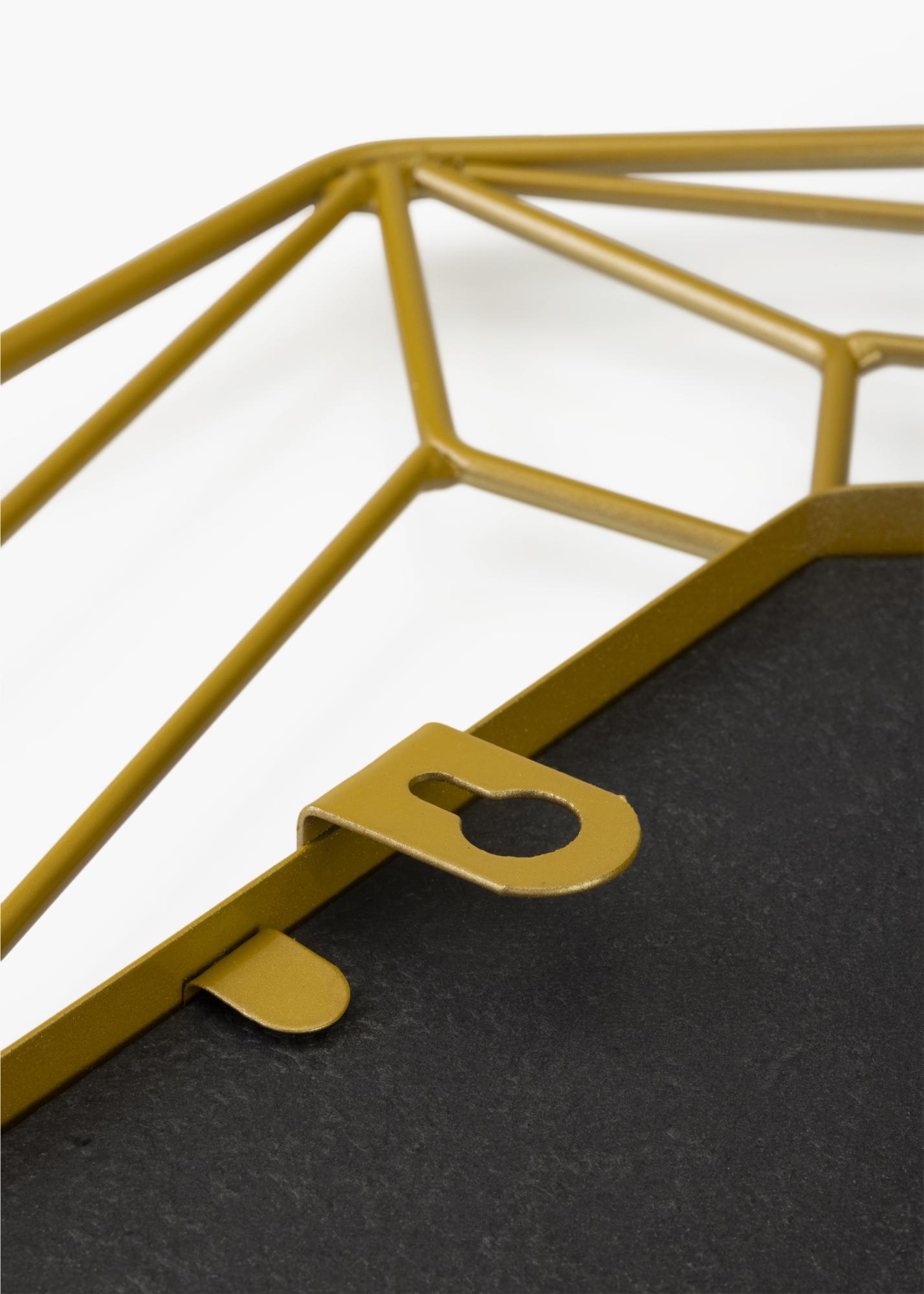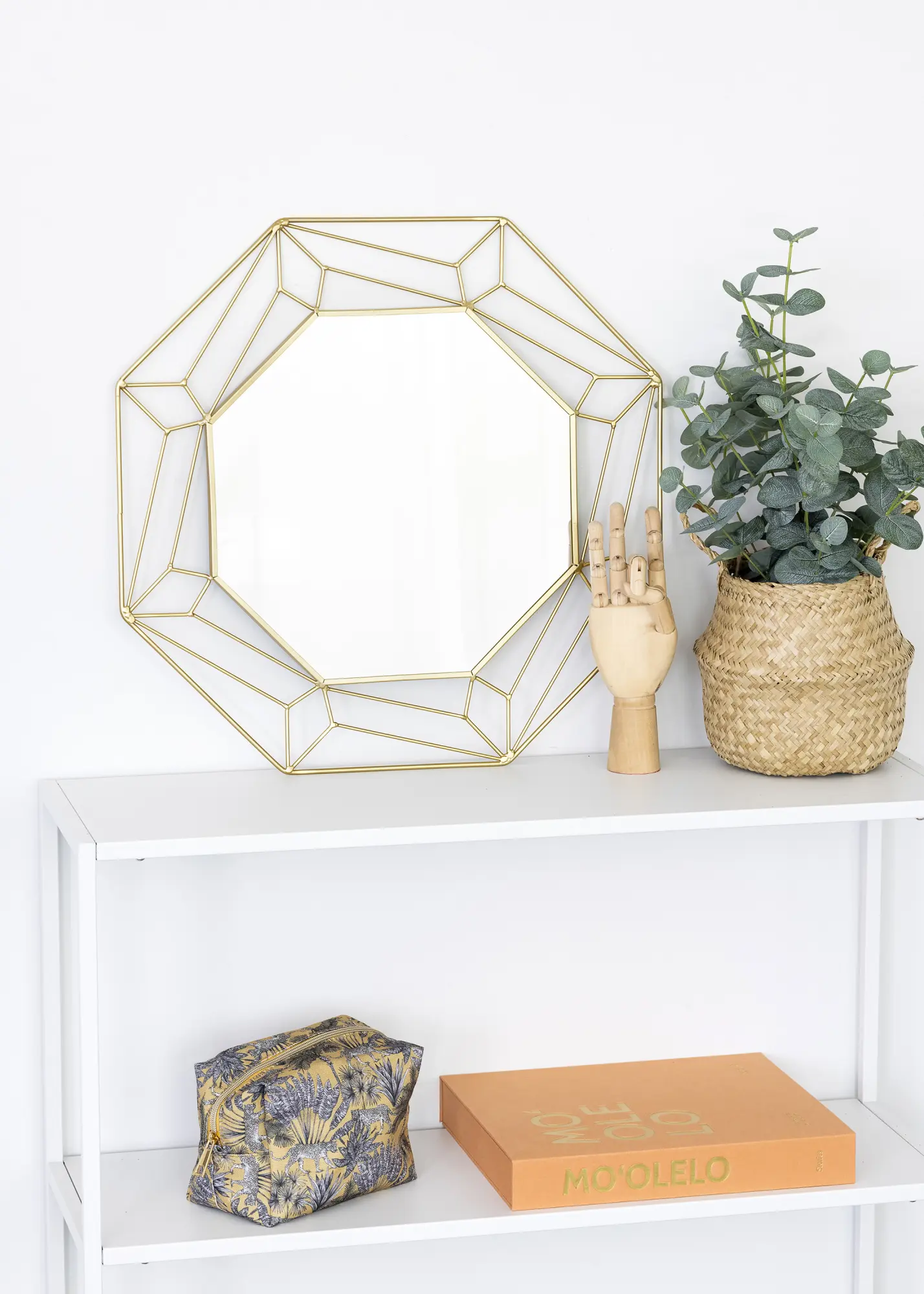 Voici un miroir dans un joli design abstrait par KAILA ! Autour de la surface du miroir de forme hexagonale au milieu se trouve un bord en métal de couleur laiton qui forme un joli motif. La teinte dorée donne à ce miroir une touche luxueuse et convient donc particulièrement à ceux qui désirent une maison esthétique et élégamment décorée ! Le miroir mesure 50x50 cm et il est conçu en métal. Au revers du miroir se trouvent des supports muraux.
