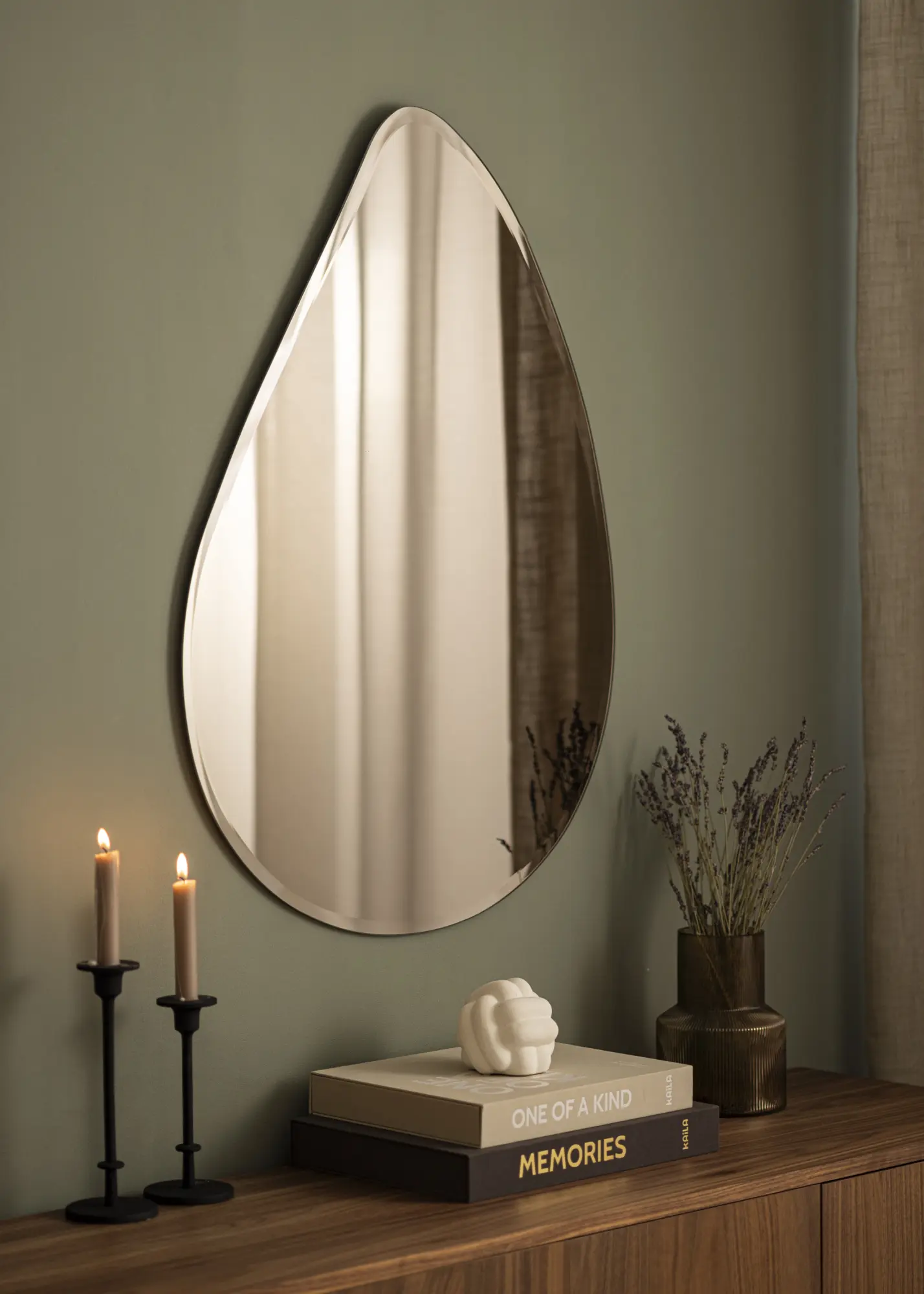Ce miroir tendance en forme de goutte comporte un verre miroir des plus tendance, teinté d'une élégante nuance de bronze foncé. Le verre miroir teinté donne un excellent effet et la belle couleur bronze est facile à assortir avec de nombreux schémas de couleurs différents. Le miroir est très mince et n'a pas de cadre, ce qui, en combinaison avec le bord biseauté luxueux, amplifie l'aspect élégant et moderne. C'est un miroir mural très décoratif qui ne manquera pas d'attirer l'attention, quelle que soit la pièce dans laquelle il est placé : dans le salon comme dans le vestibule ou la chambre à coucher.