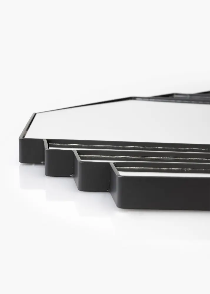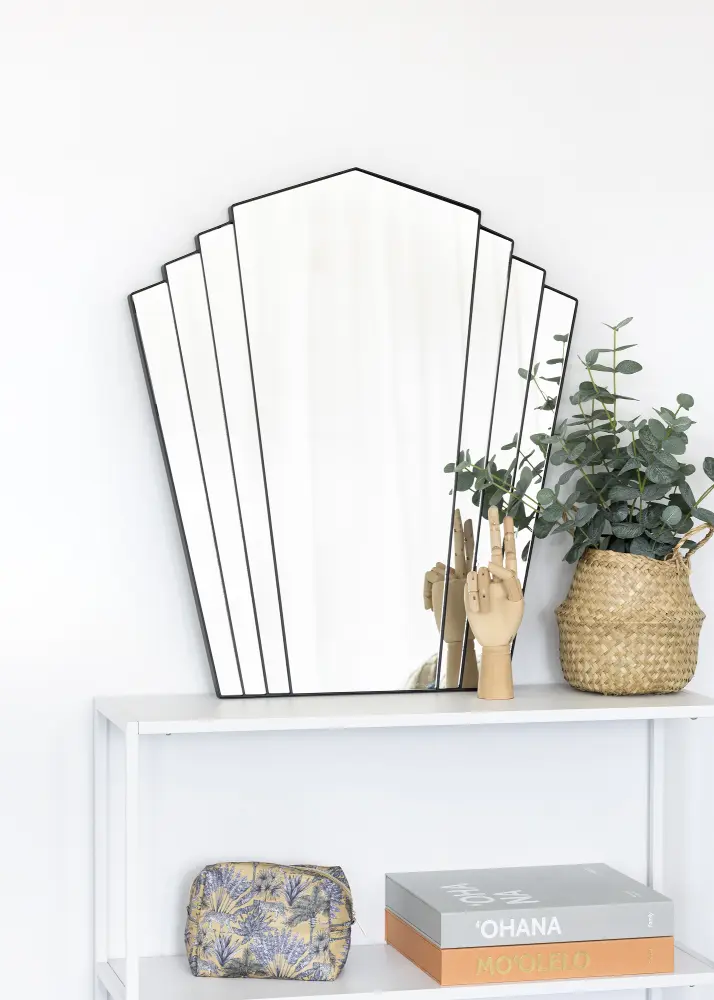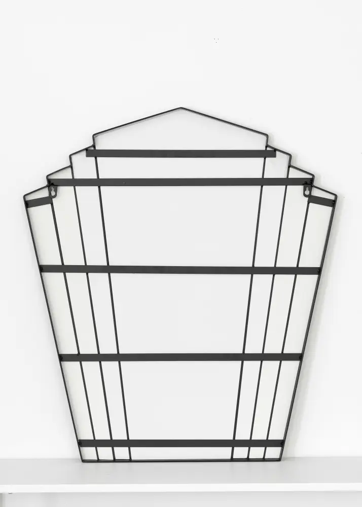 Voici un miroir mural au design unique et tendance par KAILA. Le miroir a un design qui apporte l'impression que plusieurs miroirs se trouvent derrière ce premier. Les différentes parties sont élégamment encadrées par des bords en métal noir qui donnent au miroir une atmosphère industrielle. Le miroir mesure 63x70,5 cm. Les supports muraux sont inclus.