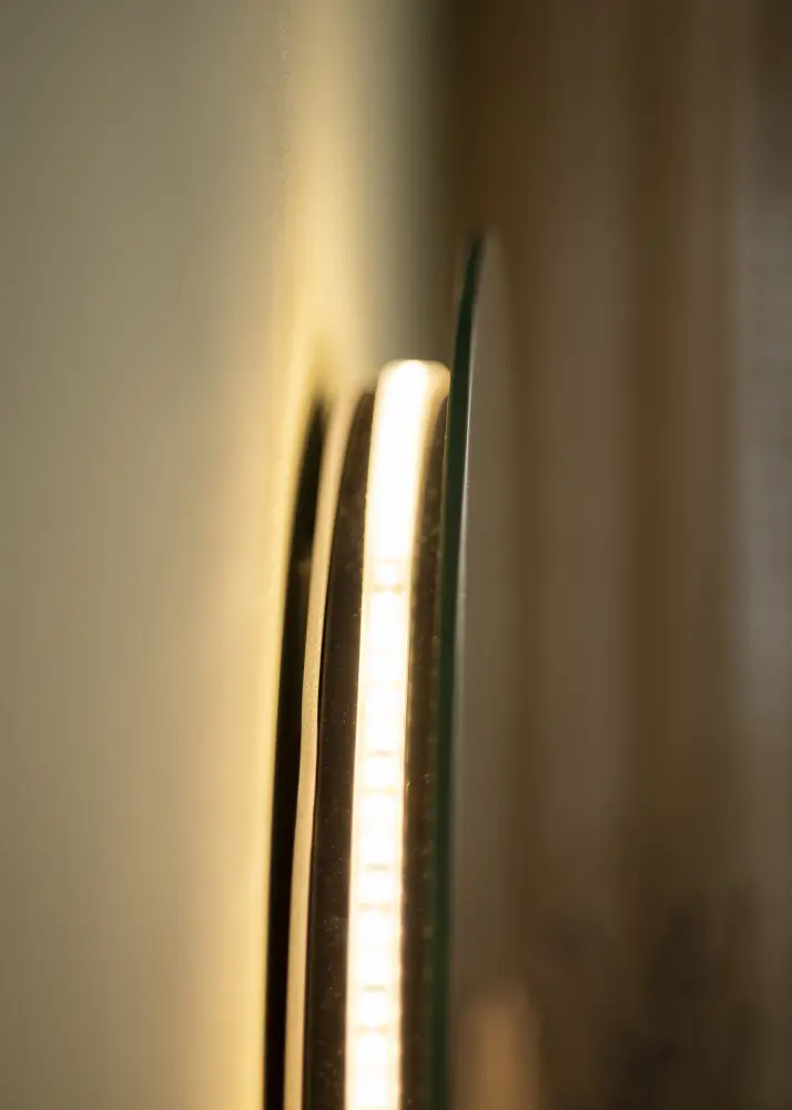 Voici un miroir de salle de bain classique de forme ronde par le suédois KAILA. Le miroir de salle de bain est doté d'un éclairage LED à intensité variable intégré sur son pourtour et qui projette une lumière vers l'arrière, ce qui projette une belle lueur blanche chaude vers l'avant en 3000K. L'éclairage peut s'atténuer, vous pouvez facilement régler la puissance de la luminosité en maintenant le bouton enfoncé pendant quelques secondes. La LED est une source de lumière écoénergétique qui fournit une lumière uniforme et naturelle.