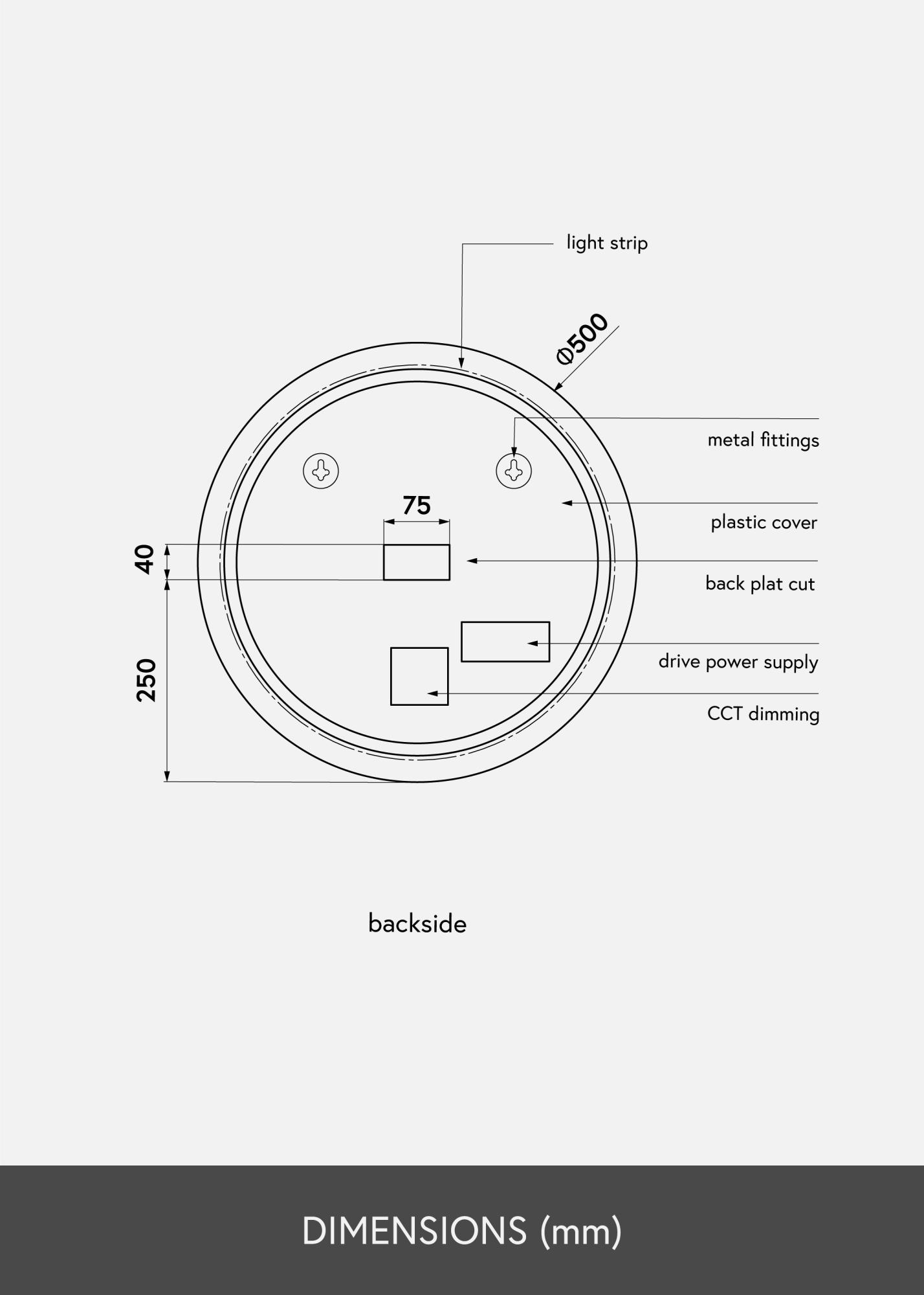 Le miroir est adapté pour les salles de bain mais grâce à son design intemporel et élégant, il a également fière allure sur les autres murs de la maison. Le miroir mesure 50 cm de diamètre, il ne fait que 3 cm d'épaisseur et est doté de supports muraux. Le miroir est destiné à une installation fixe et se connecte à un interrupteur. Afin que le miroir puisse fonctionner correctement, celui-ci doit être connecté à un interrupteur normal et non à un gradateur de lumière.