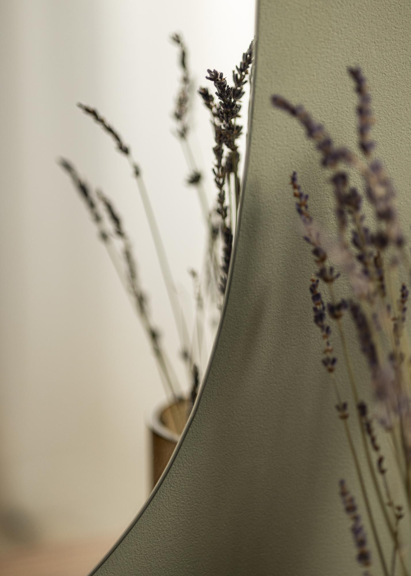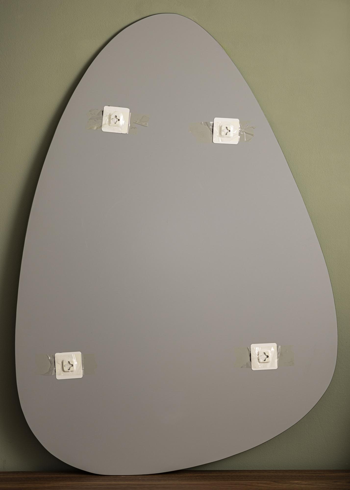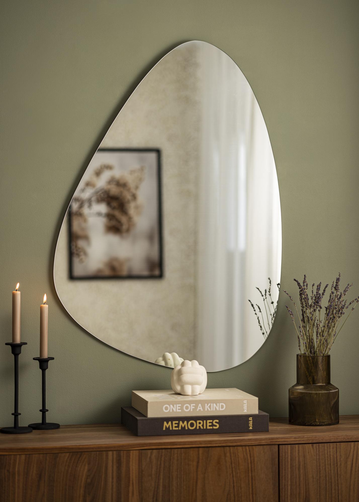 Ce miroir a une forme tendance et asymétrique, presque comme un œuf. Une forme douce et élégante qui crée une atmosphère légère et accueillante dans la pièce dans laquelle elle se trouve. Le miroir est également très mince, ce qui rehausse d'autant plus son élégance.