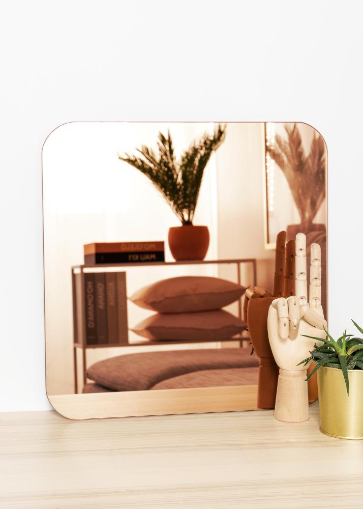 Ce miroir carré a des coins arrondis décoratifs qui lui donnent une impression douce et élégante. Le miroir est également très mince et n'a pas été équipé d'un cadre, pour une sensation très tendance et minimaliste. De plus, le verre du miroir est teinté dans une nuance chaude d'or rose, ce qui fait de ce miroir un détail de décoration vraiment élégant et moderne dans votre maison.