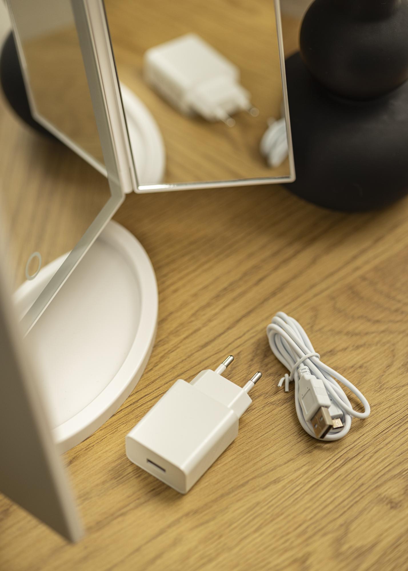 Le miroir est alimenté par 4 piles AA (non incluses) ou chargé avec l'adaptateur mural USB et le câble USB inclus.