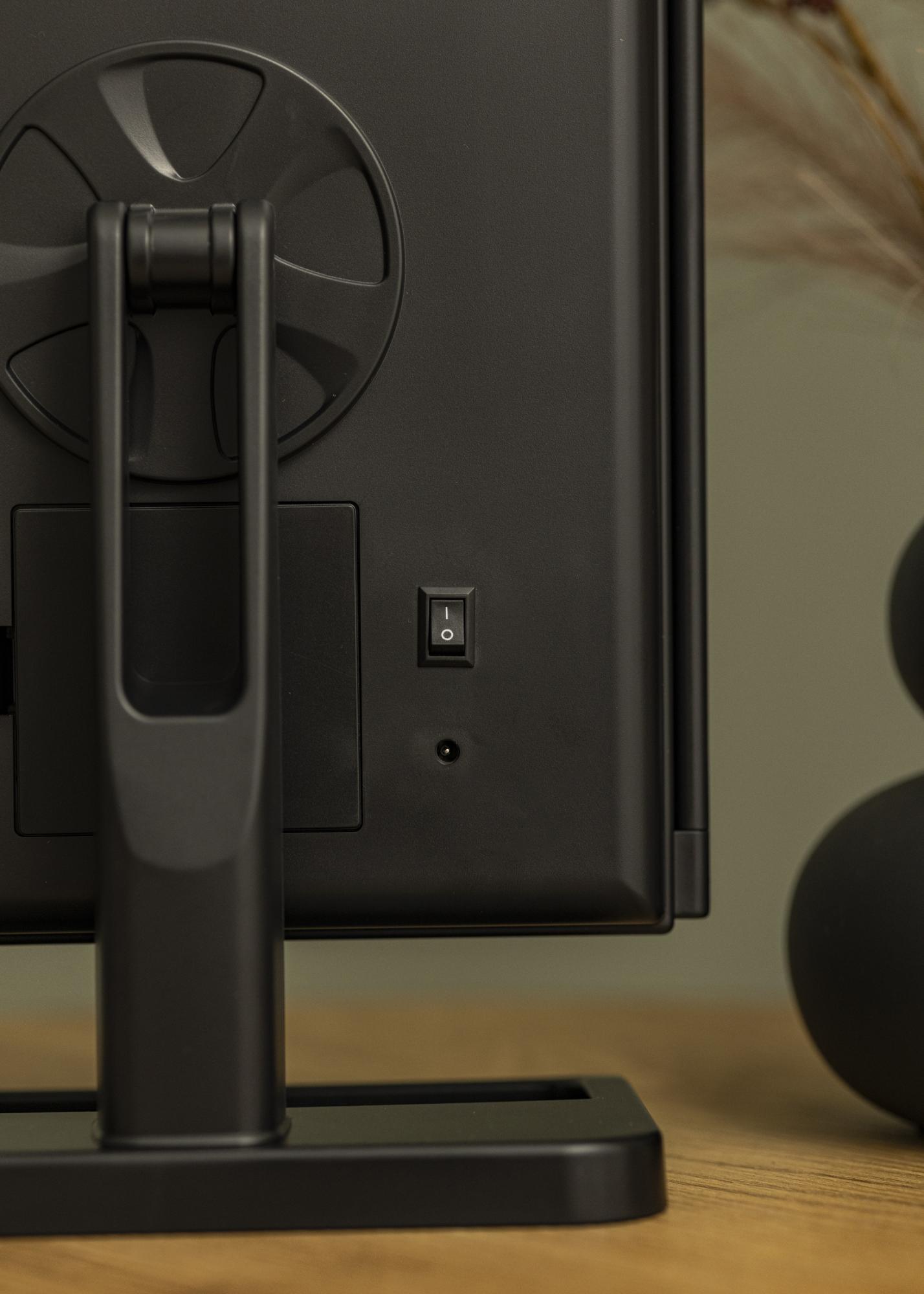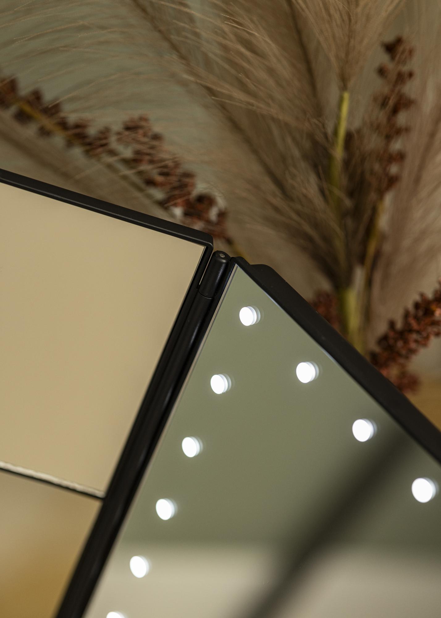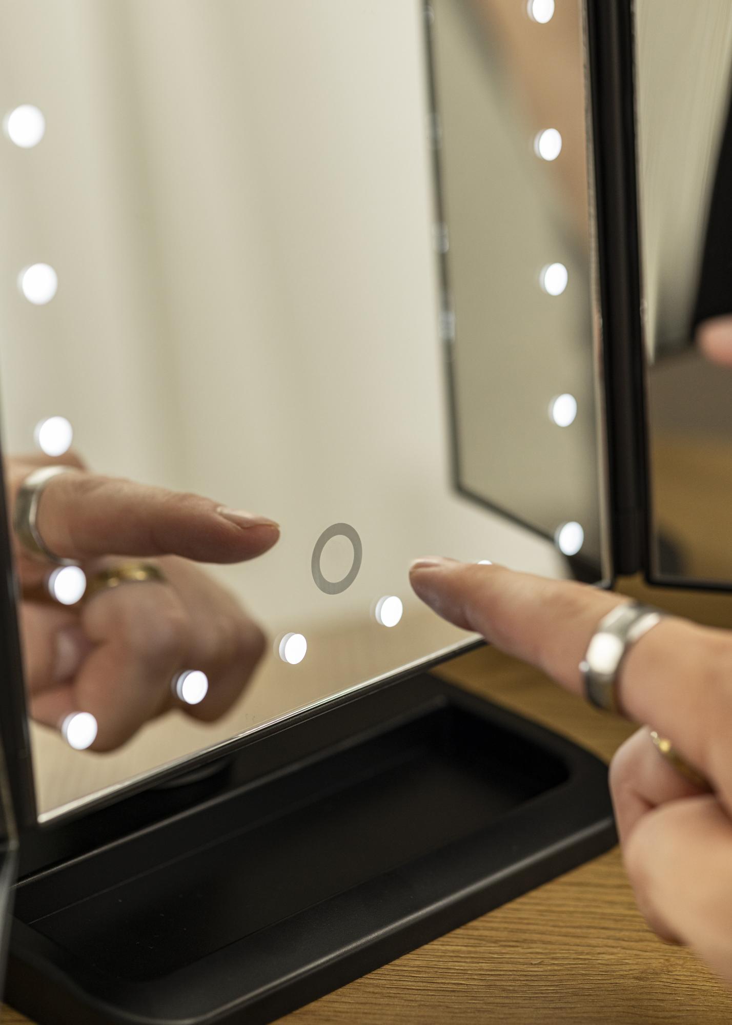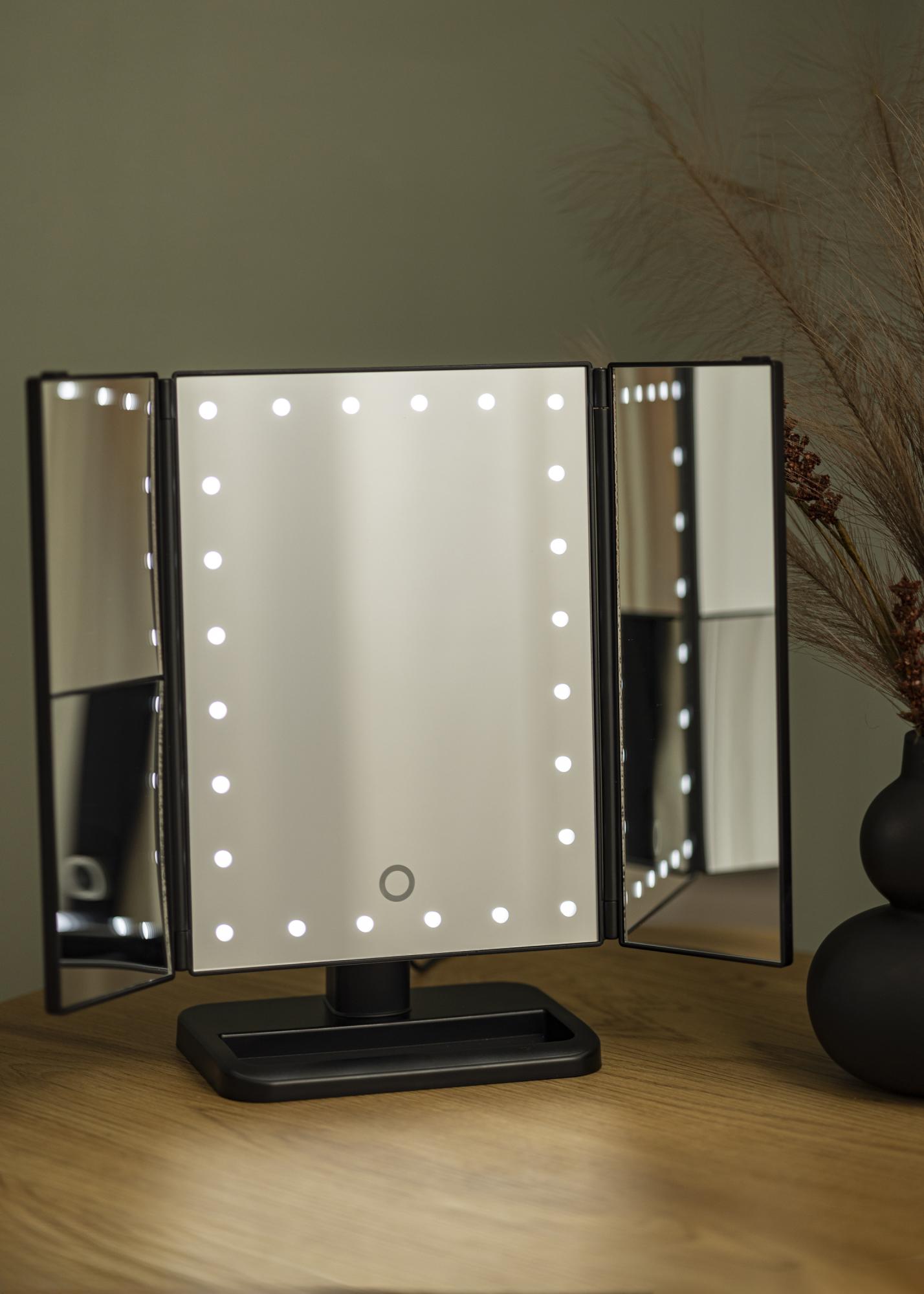 Un miroir de maquillage 4 en 1 tendance en noir au design nordique par KAILA. Ce miroir de maquillage vous donne la possibilité de vous refléter sous différents angles avec trois côtés de miroir et dispose d'un pied ajustable qui permet de faire pivoter le miroir à 180°. Le côté gauche du miroir de maquillage a un verre miroir à effet grossissant jusqu'à un zoom x2 et x3. Autour de la grande surface du miroir du milieu se trouvent 24 lampes LED décoratives qui donnent une agréable lueur blanche chaude en 3000K. L'éclairage LED intégré est allumé en appuyant sur le bouton tactile et se règle facilement en maintenant le bouton enfoncé pendant quelques secondes. Le miroir de maquillage mesure 38x25 cm et peut être facilement plié lorsqu'il n'est pas utilisé