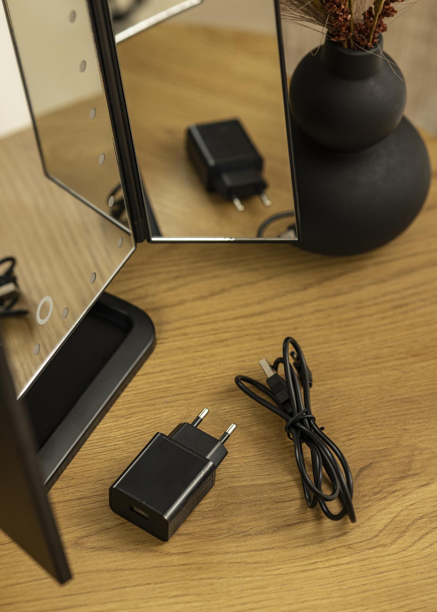 Le miroir de maquillage est en ABS pour la meilleure qualité possible et la source de lumière LED est une lumière naturelle qui consomme moins d'énergie. Le miroir est alimenté par 4x piles AA (non incluses) ou chargé avec l'adaptateur mural USB et le câble USB inclus.