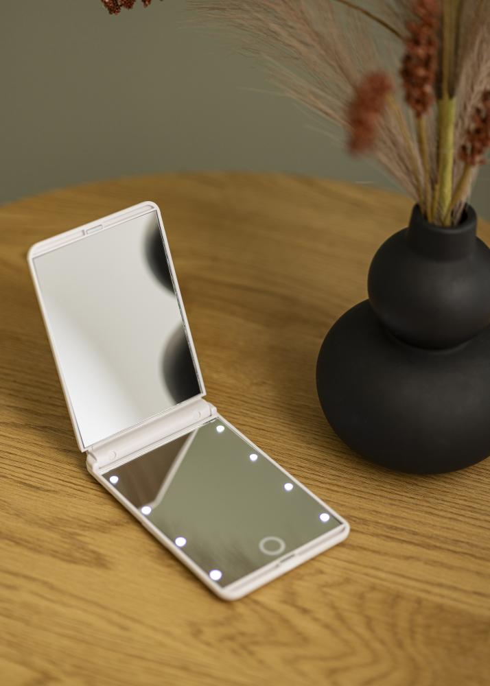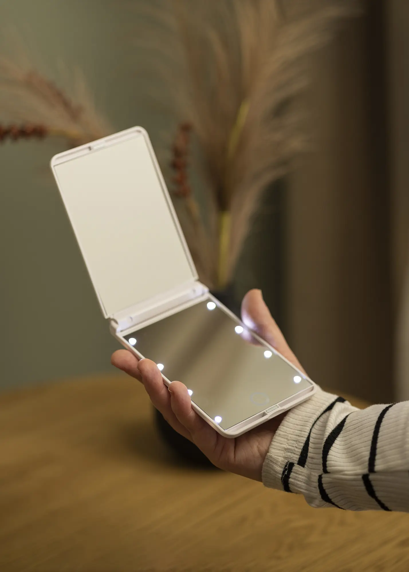 Il s'agit d'un miroir de maquillage pliable au design élégant en blanc qui vous permet de vous refléter facilement où que vous soyez. Le miroir de maquillage a un éclairage intégré autour du verre de miroir transparent sous la forme de 8 lumières LED puissantes. Le miroir supérieur a une verre miroir grossissant x2. L'éclairage LED est ajustable et donne une agréable lueur blanche chaude en 3000K qui est facilement réglée en maintenant le bouton tactile sur l'écran.