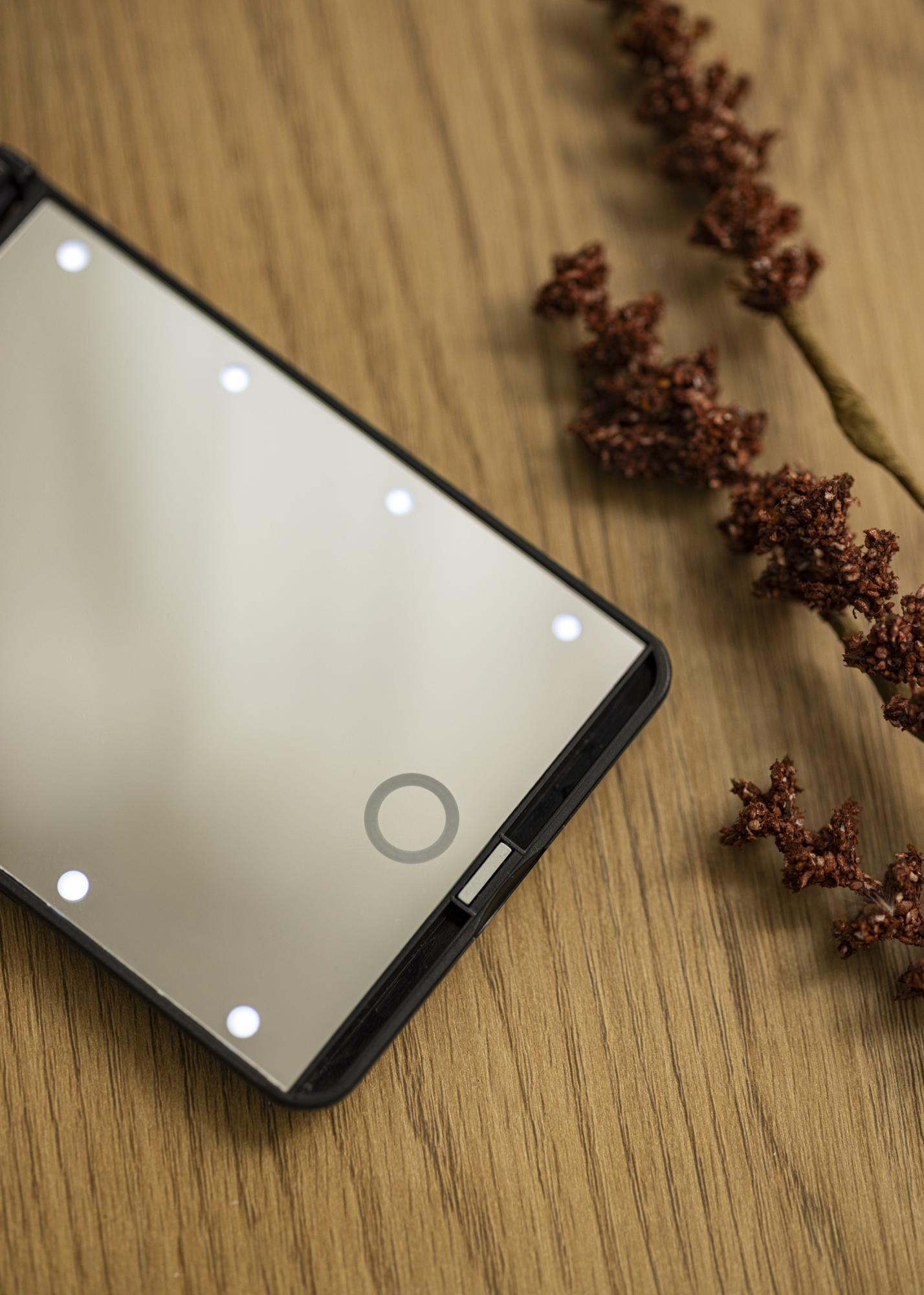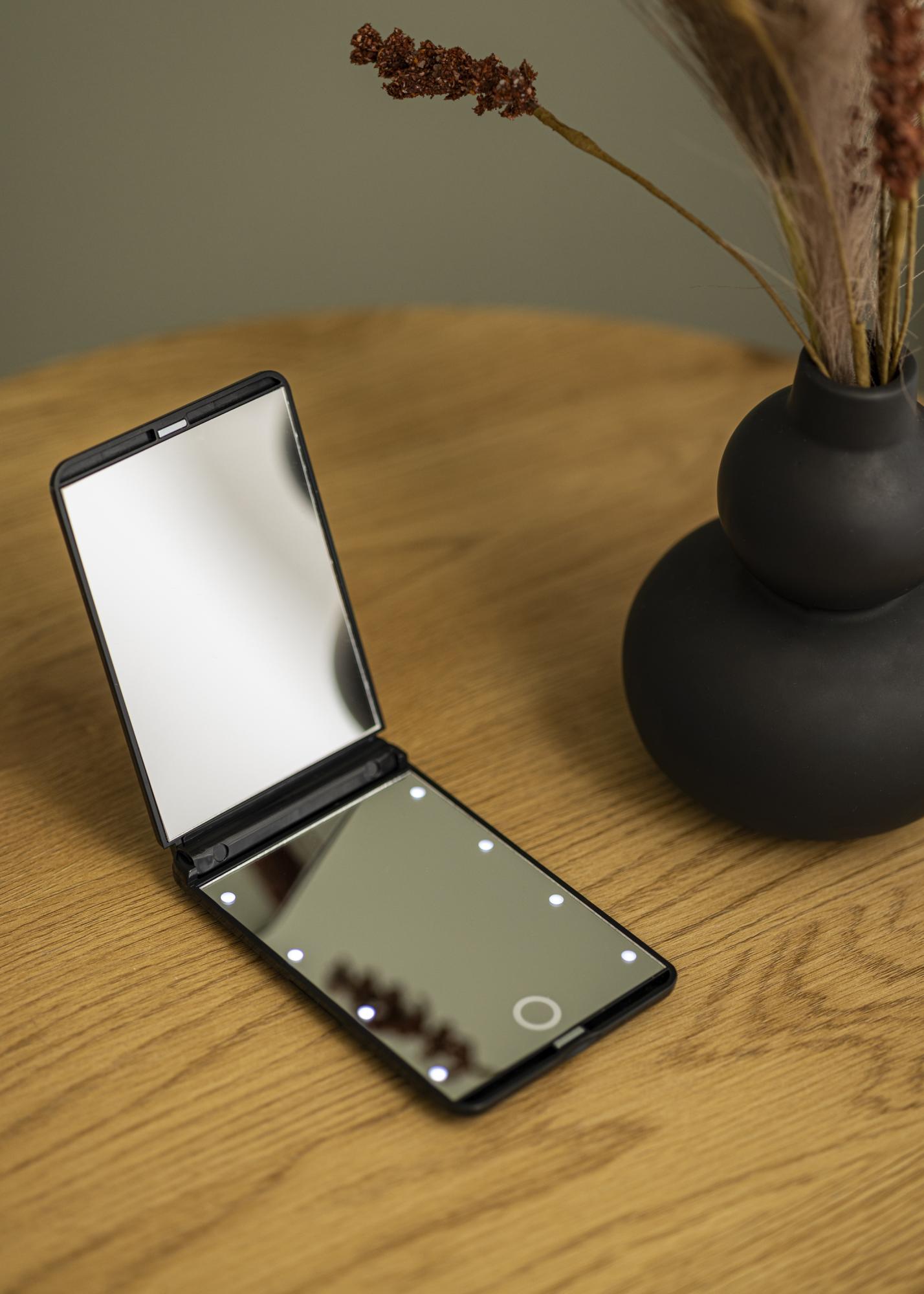 Il s'agit d'un miroir de maquillage pliable au design élégant en noir qui vous permet de vous refléter facilement où que vous soyez. Le miroir de maquillage a un éclairage intégré autour du verre de miroir transparent sous la forme de 8 lumières LED puissantes. Le miroir supérieur a une verre miroir grossissant x2. L'éclairage LED est ajustable et donne une agréable lueur blanche chaude en 3000K qui est facilement réglée en maintenant le bouton tactile sur l'écran.
