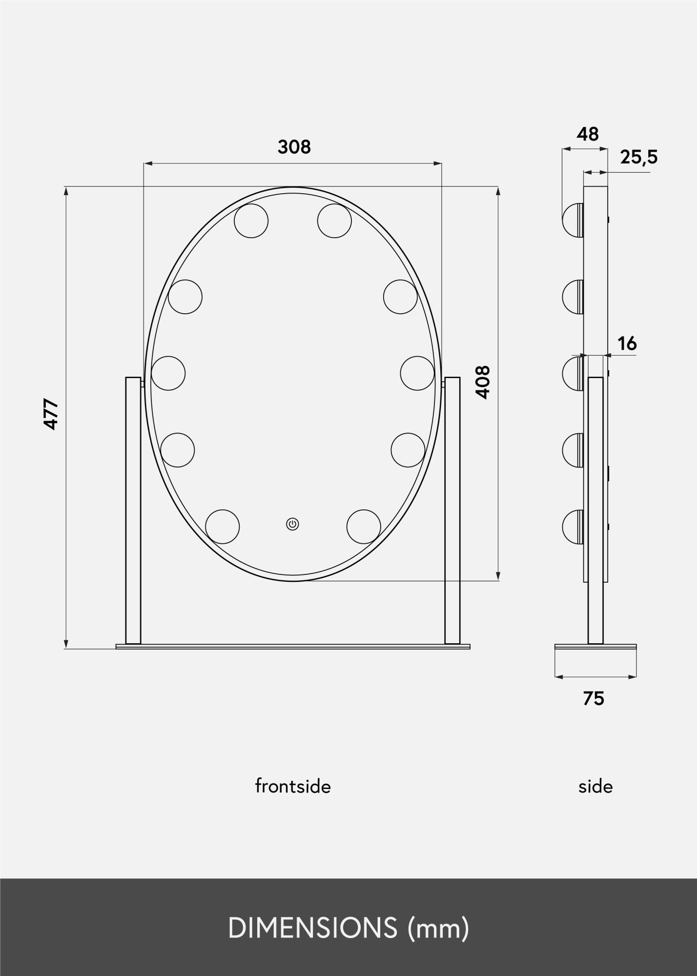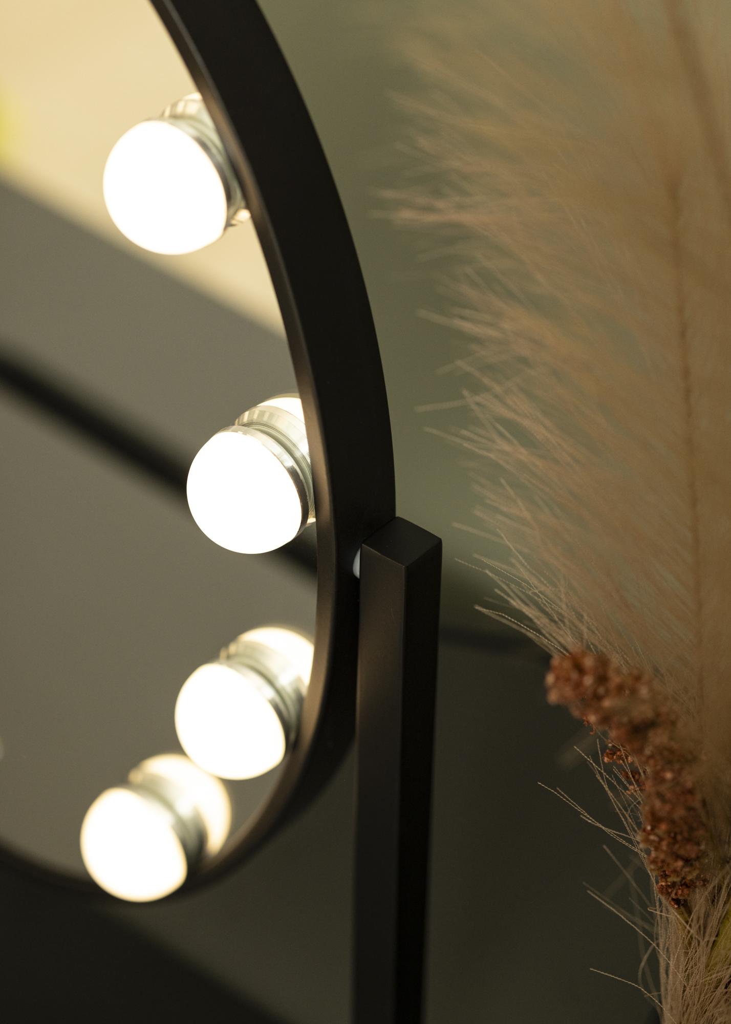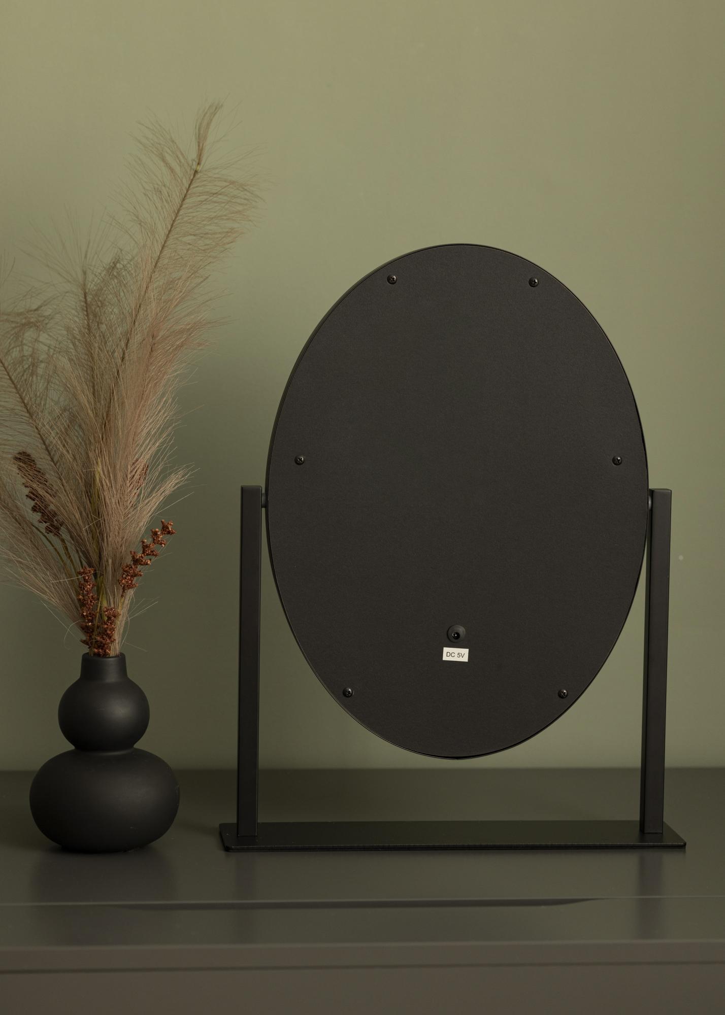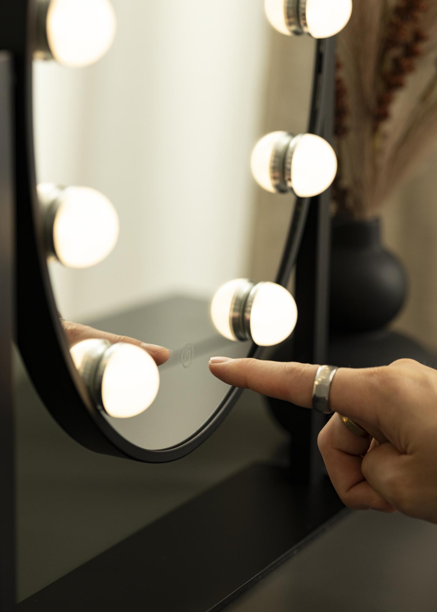 Voici un miroir de maquillage de forme ovale élégante de la marque suédoise KAILA. Le miroir de maquillage est dans un design noir esthétique et dispose d'un éclairage LED à intensité variable intégré. L'éclairage LED sous forme de 10 ampoules donne une teinte blanche uniforme et chaude en 3000K. L'éclairage s'allume en appuyant sur le bouton tactile et l'intensité est facilement ajustée en maintenant le bouton enfoncé pendant quelques secondes. Les LED sont une source de lumière économe en énergie avec une lumière naturelle qui est parfaite pour le maquillage. Le miroir de maquillage mesure 34x47 cm et peut être rotatif à 360° verticalement, ce qui signifie que vous pouvez facilement vous refléter sous différents angles. Le design intemporel et glamour crée une atmosphère hollywoodienne dans votre maison !