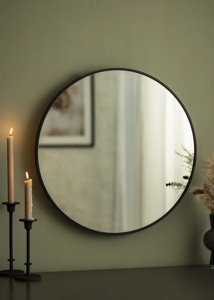 KAILA Round Mirror Edge Black est un miroir rond avec un cadre métallique fin et élégant en noir mat, ce qui lui donne un aspect industriel et tendance. Le cadre a, selon la taille, une profondeur comprise entre 30 et 40 mm, ce qui signifie que le verre du miroir sort un peu du mur et crée un effet 3D intéressant. La profondeur du cadre donne également au miroir une sensation de solidité tout en conservant son aspect minimaliste. Un miroir rond parfait à placer dans n'importe quelle pièce où vous souhaitez ajouter de la fonctionnalité et un design nordique élégant !