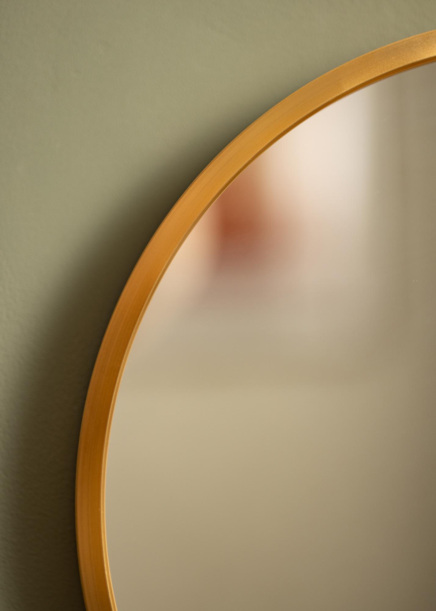 Un miroir rond au design nordique élégant avec un cadre en métal dans une belle finition dorée. Le cadre a une surface brossée, ce qui donne à la belle couleur or un aspect légèrement plus mat. La finesse du cadre est tendance, mais en même temps, en fonction de la taille, le cadre a une profondeur comprise entre 30 et 40 mm, ce qui signifie qu'il sort un peu du mur et crée un effet 3D intéressant. La profondeur du cadre donne également au miroir une sensation de solidité et de robustesse, sans éliminer la sensation minimaliste du miroir.