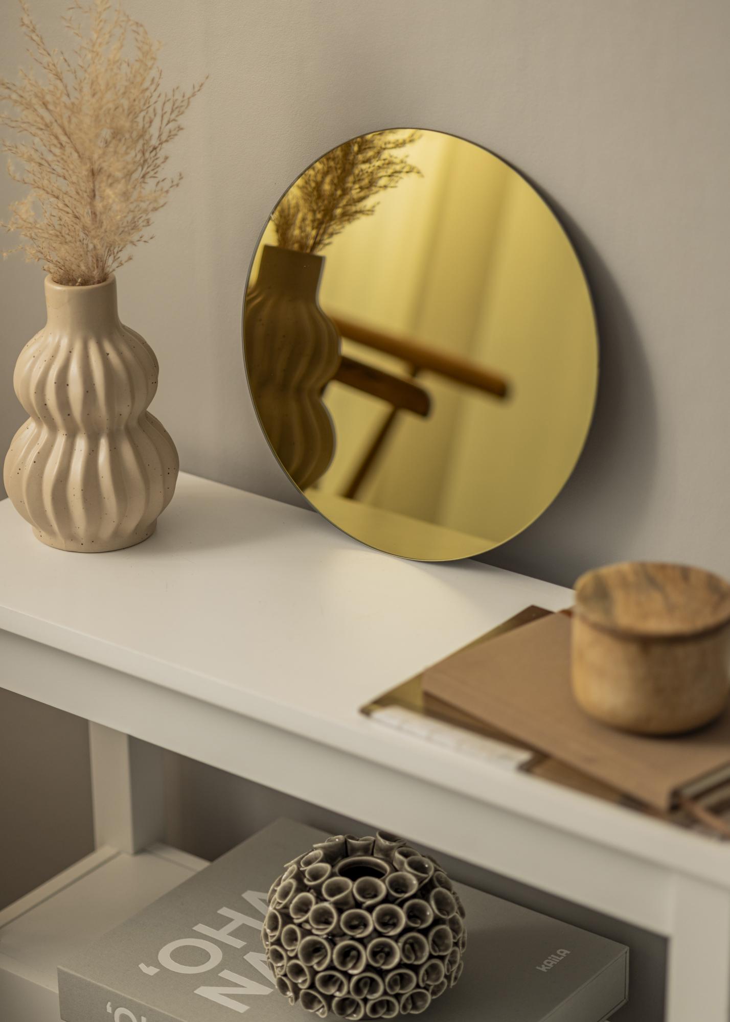 Ce miroir rond est élégant et a du stylé, tout en étant luxueux et exclusif. Cela découle de l'heureuse combinaison de détails efficaces et de la forme épurée. Le miroir est mince et n'a pas de cadre, ce qui contribue à l'aspect élégant. Le verre miroir teinté or contribue à son tour à rehausser l'ensemble et à ajouter une sensation d'exclusivité.