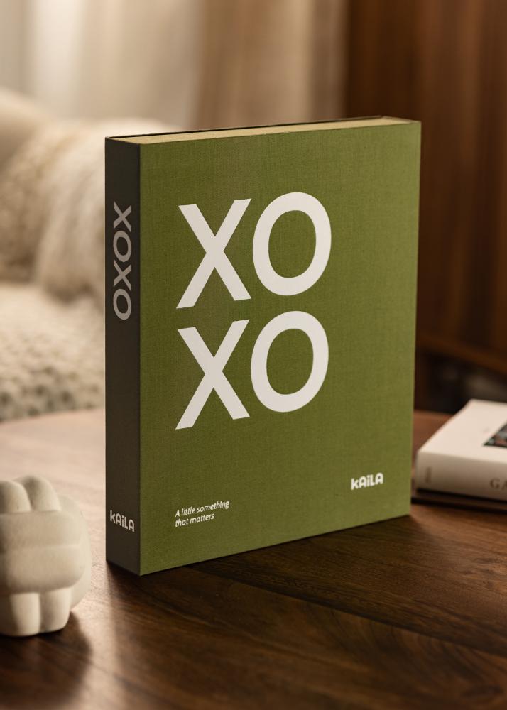 Ce bel abum photo est conçu comme un Coffee Table Book tendance et est également appelé unCoffee Table Photo Album. La couverture est élégamment habillée de textile vert olive et sur le devant et le dos de l'album se trouve un imprimé blanc avec la célèbre salutation d'au revoir "XOXO" qui signifie baisers et câlins. Ce titre tendance est également complété par un sous-titre qui précise "A little something that matters", imprimé dans le coin inférieur gauche de l'album. C'est un album photo très esthétique avec un design original et ludique qui est assuré de se démarquer de la foule.