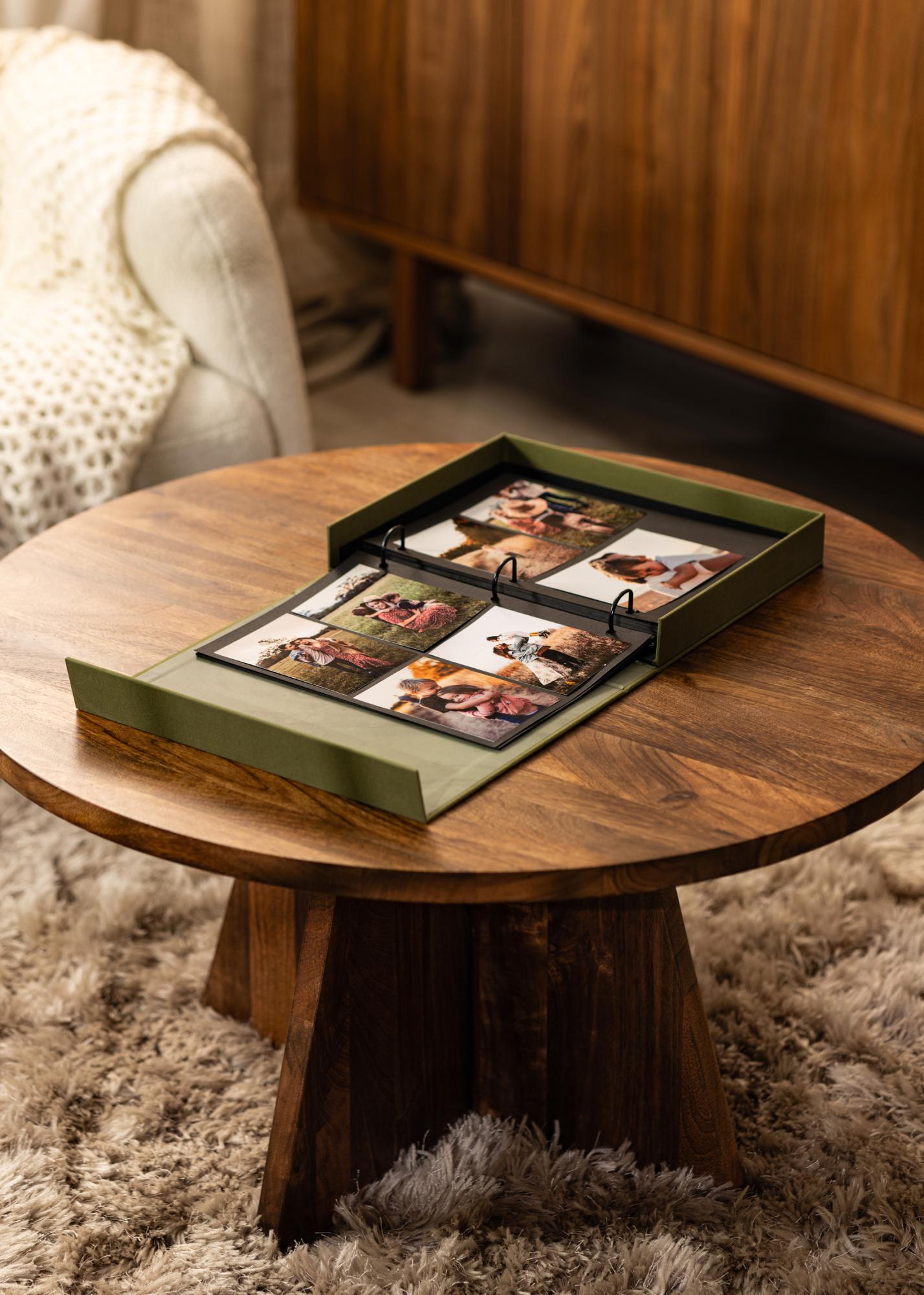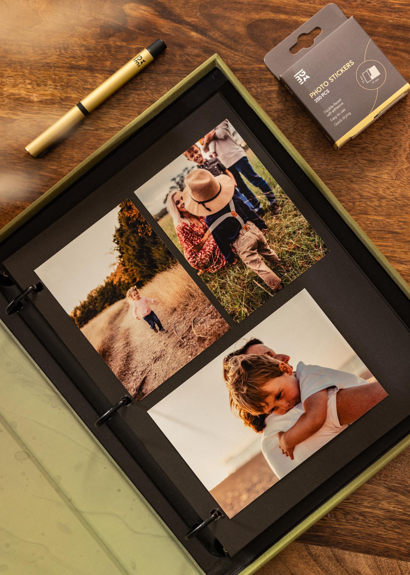 L'album photo est conçu comme une boîte luxueuse que vous ouvrez pour accéder au contenu. Lorsque vous ouvrez l'album, vous rencontrez un classeur à anneaux et 30 feuilles noires (60 pages) à remplir de vos souvenirs les plus mémorables. Vous collez vous-même vos images, ce qui vous donne à la fois flexibilité et espace pour libérer votre côté créatif.