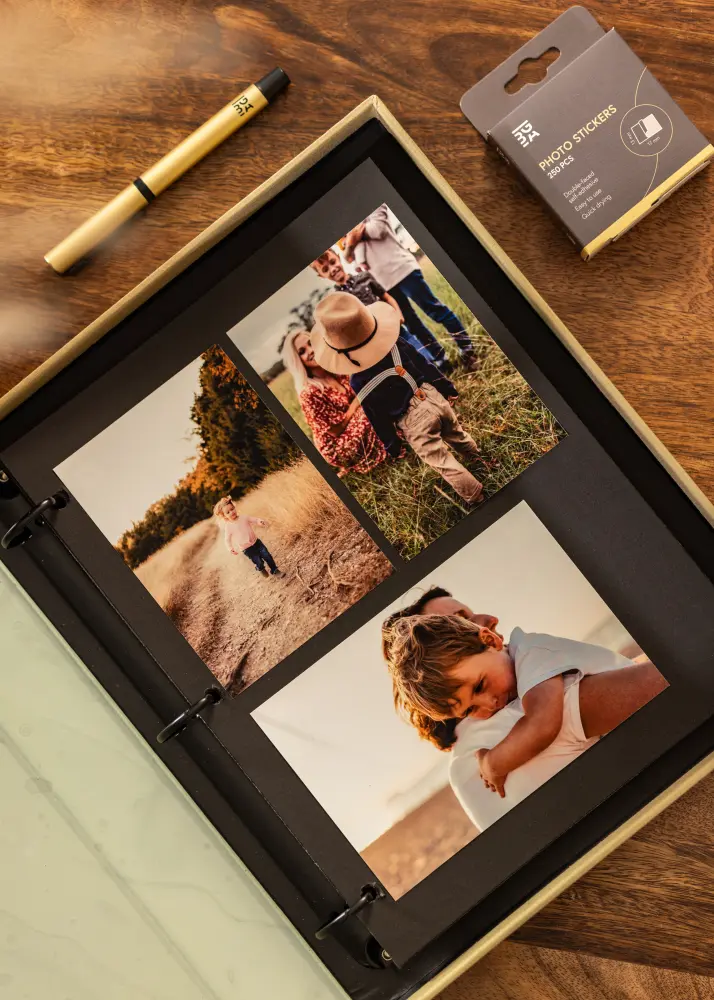 L'album photo est conçu comme une boîte luxueuse que vous ouvrez pour accéder au contenu. Lorsque vous ouvrez l'album, vous rencontrez un classeur à anneaux et 30 feuilles noires (60 pages) à remplir de vos souvenirs les plus mémorables. Vous collez vous-même vos images, ce qui vous donne à la fois flexibilité et espace pour libérer votre côté créatif.
