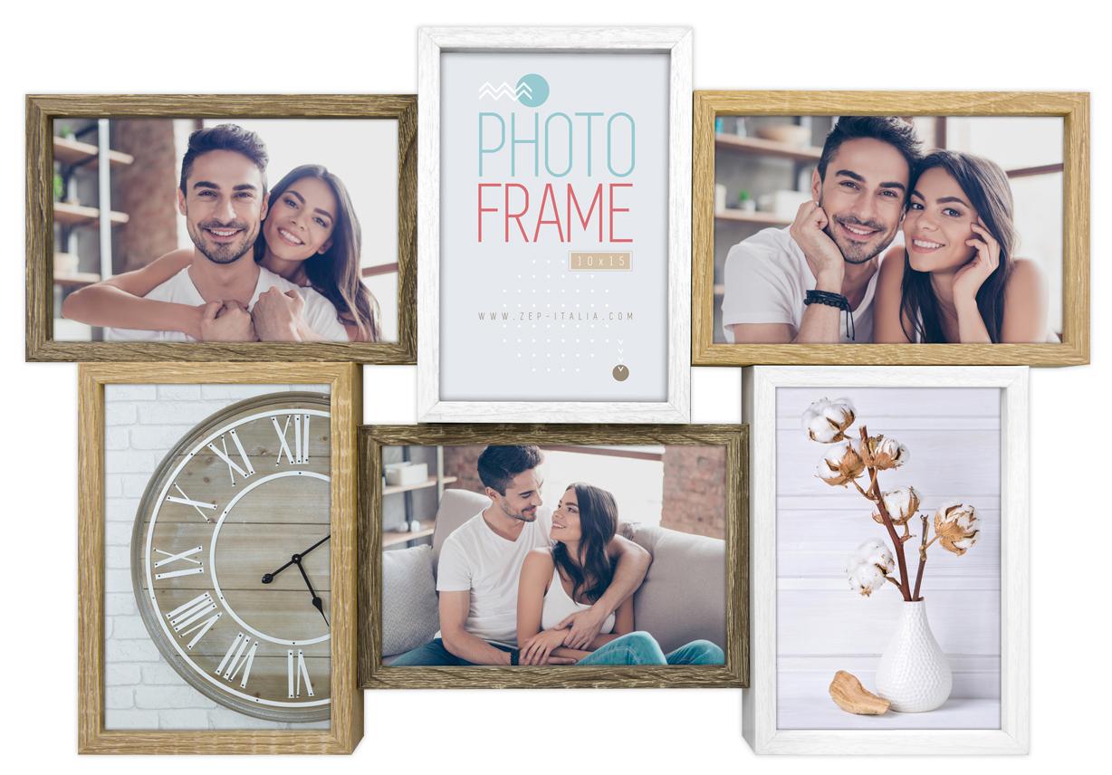 Joli cadre multivues conçu en bois. Le cadre se présente dans différentes teintes mais dispose toujours un design épuré avec des cadres soignés dans des tons naturels. Pourquoi ne pas collectionner vos 6 meilleurs souvenirs photo et les immortaliser dans ce cadre afin de toujours les revivre ! Ce cadre multivues peut contenir 6 motifs au format 13x15 cm. Supports muraux inclus.