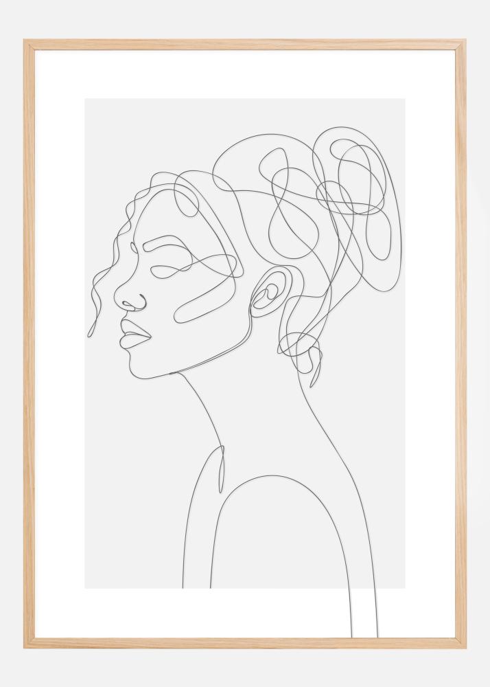 Ce dessin au trait saisissant représente le buste d'une femme regardant vers la gauche de la toile. Ses cheveux bouclés sont attachés en un chignon au sommet de sa tête. Chaque ligne s'enchaîne habilement à la suivante sans jamais quitter l'estampe comme un symbole de la vie du personnage. Un début, une fin. Une affiche belle et mystérieuse pour tout environnement.