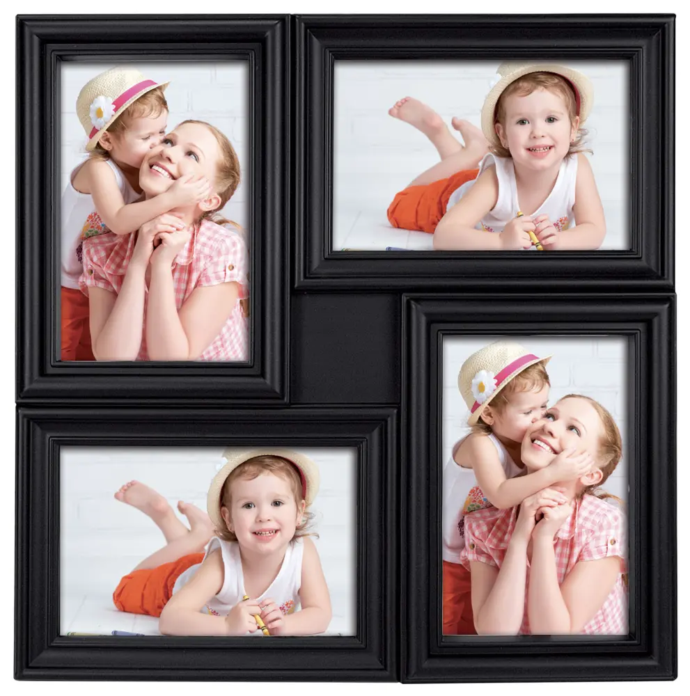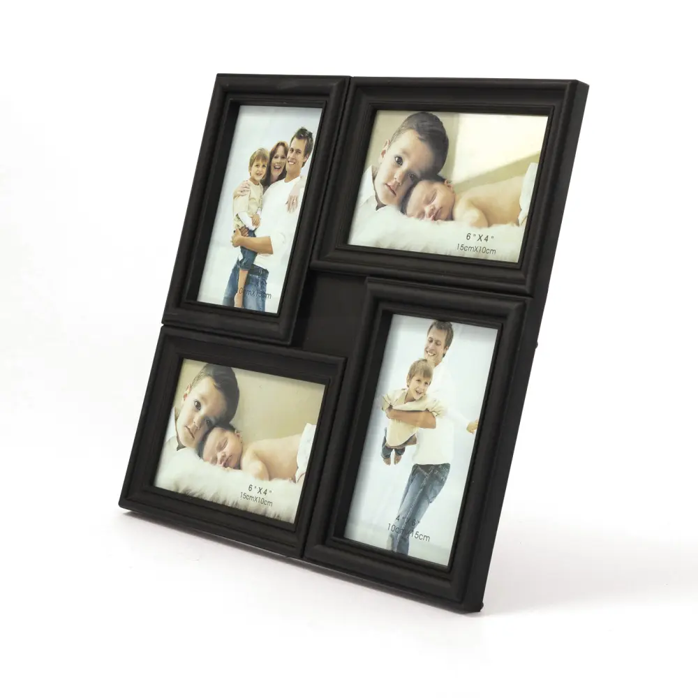 Rassemblez vos moments préférés en un seul endroit en les encadrant simplement dans un cadre multivues! Ce cadre multivues a de l'espace pour 4 images aux formats 10x15 cm, 2 dans un format portrait et 2 dans un format paysage. Le cadre multivues se présente dans une jolie teinte noire et il est fabriqué en matériau composite. Supports muraux inclus. Les dimensions intérieures du cadre sont de 33x33 cm et sa forme carré apporte à ce cadre une apparence esthétique, et en fait un tableau décoratif pour votre maison !