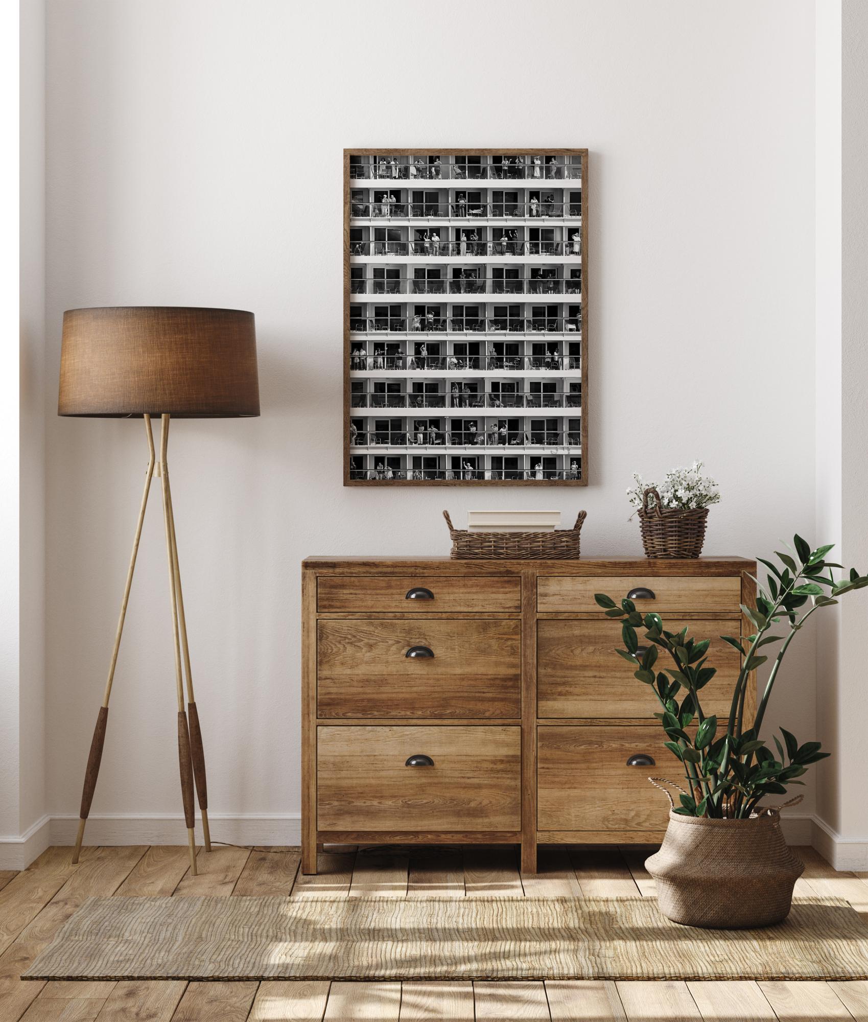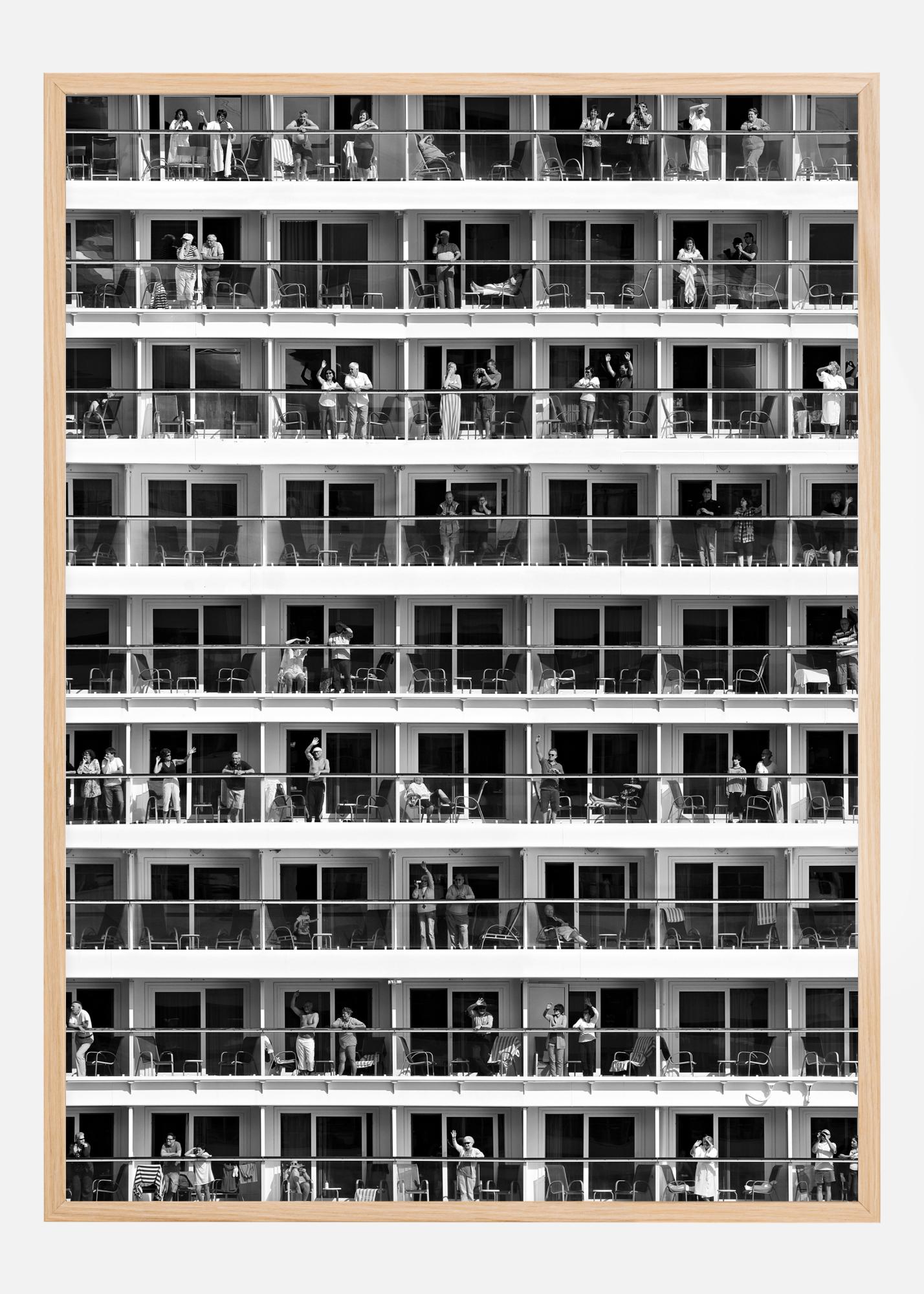 Une affiche géométrique de voyage montrant des rangées de balcons avec des personnes profitant du soleil. Laissez-vous envahir par l'amour en saluant tous les visages amicaux de cette photo touristique imaginative.