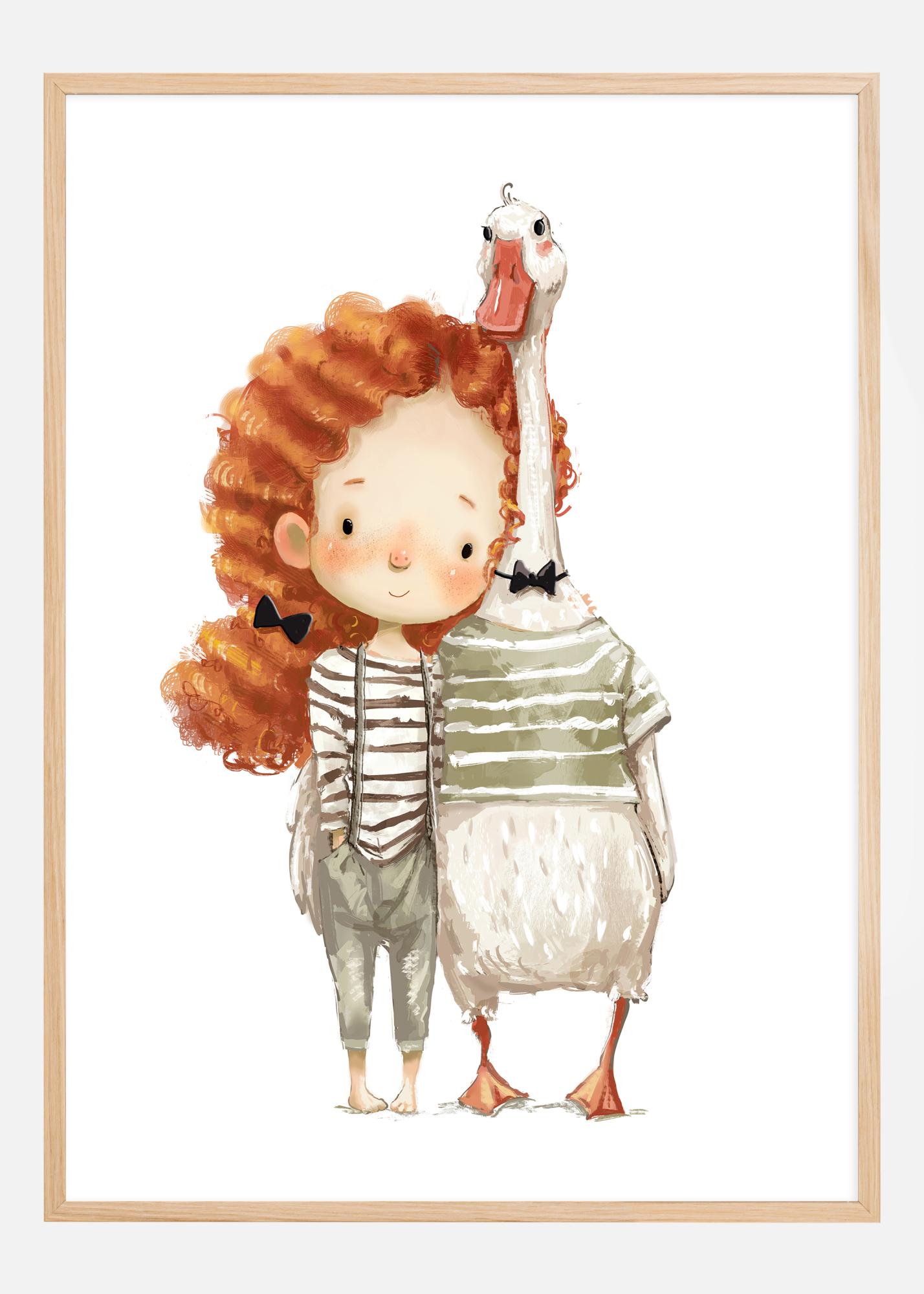 Ce poster joueur et réconfortant dépeint une jeune fille avec des boucles rouges vives, debout à côté de son fidèle compagnon, un grand canard. Ils partagent un moment tendre et joyeux ensemble, capturé dans les tons doux et chauds de l'aquarelle. Ce duo charmant, avec les joues roses de la fille et le regard curieux du canard, rayonne d'amitié et de joie.