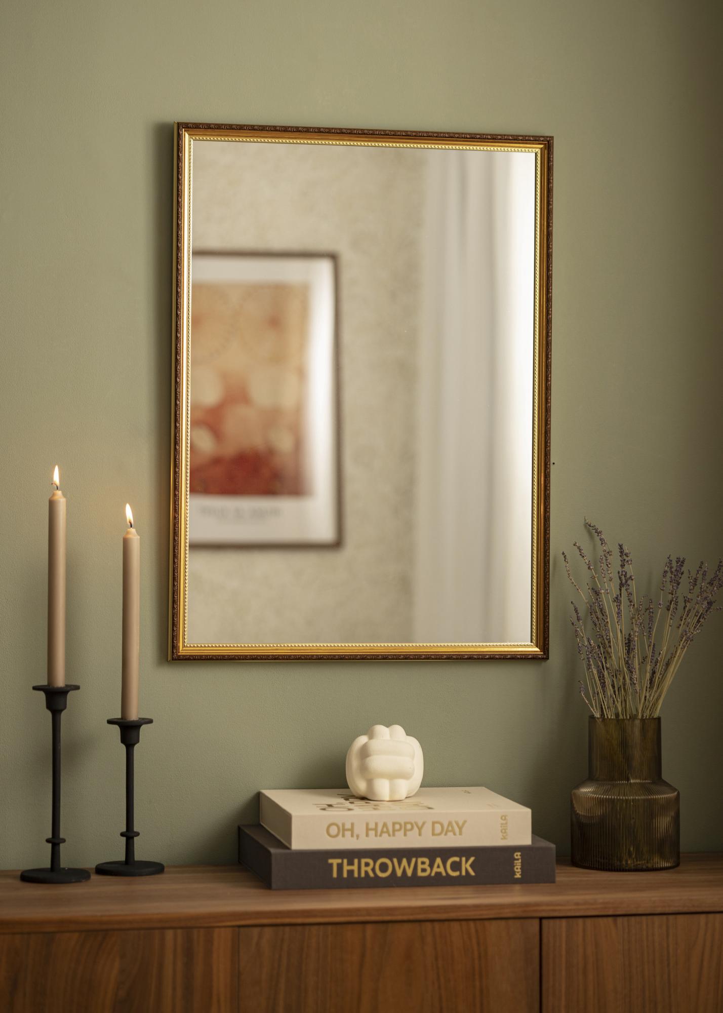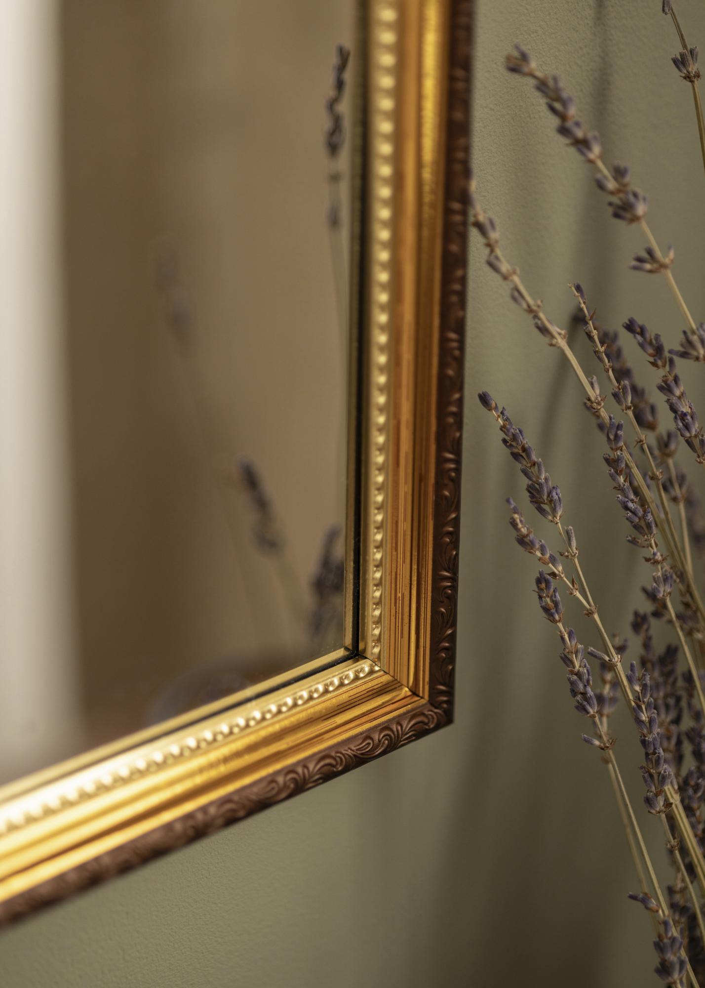 Abisko Or est un miroir mural pour ceux qui sont à la recherche d'un miroir décoratif dans un aspect rétro très élégant. Le miroir a une baguette de 25 mm de largeur de teinte brune et une couleur dorée exclusive entourant le verre miroir. Le cadre a un profil joliment ornementé, ce qui fait de ce miroir mural un élément mural esthétique convenant tout aussi bien dans l'entrée comme dans la chambre.
