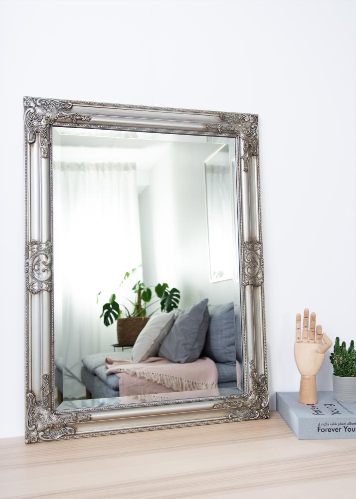 La série de miroirs Bologna Argent a un design latin paré d'une riche décoration dans les coins et au centre des côtés du cadre. Le cadre de ce miroir est légèrement plus étroit que celui de nombreux autres miroirs de ce style. Ce cadre est en bois et est orné d'une décoration qui a été coulée dans du plâtre avant d'être appliquée sur le cadre. Idéal comme miroir de salle de bain.