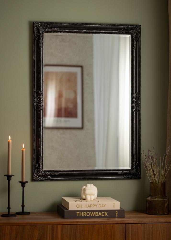 La série de miroirs Bologna Noir a un design latin paré d'une riche décoration dans les coins et au centre des côtés du cadre. Le cadre de ce miroir est légèrement plus étroit que celui de nombreux autres miroirs de ce style. Ce cadre est en bois et est orné d'une décoration qui a été coulée dans du plâtre avant d'être appliquée sur le cadre. Idéal comme miroir de salle de bain.
