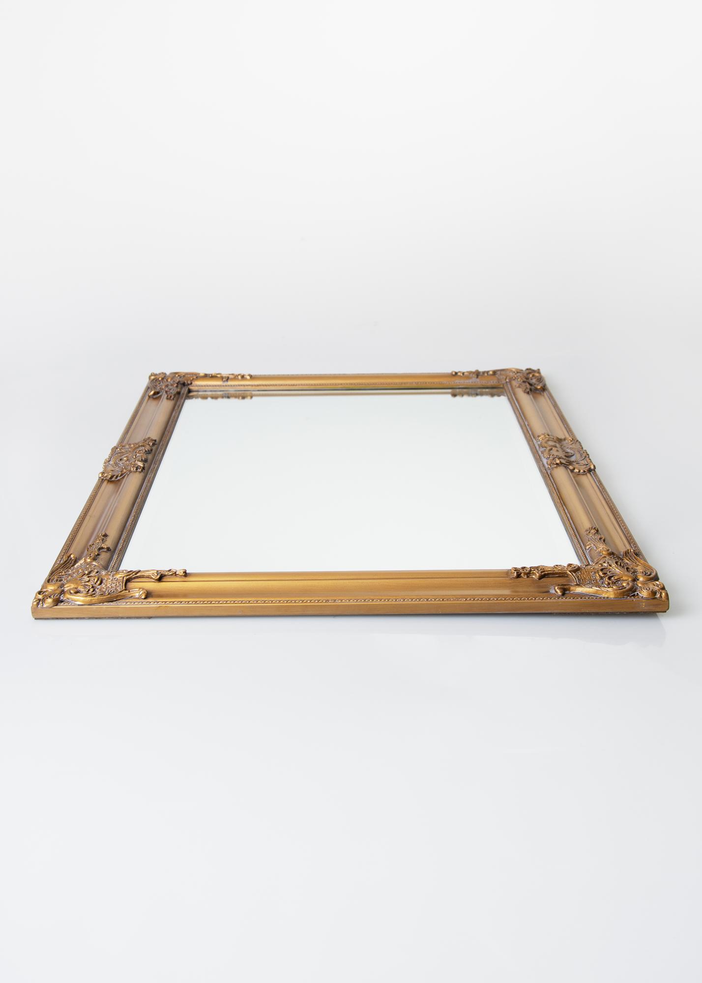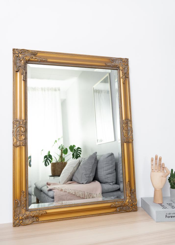 La série de miroirs Bologna or a un design latin paré d'une riche décoration dans les coins et au centre des côtés du cadre. Le cadre de ce miroir est légèrement plus étroit que celui de nombreux autres miroirs de ce style. Ce cadre est en bois et est orné d'une décoration qui a été coulée dans du plâtre avant d'être appliquée sur le cadre. Idéal comme miroir de salle de bain.