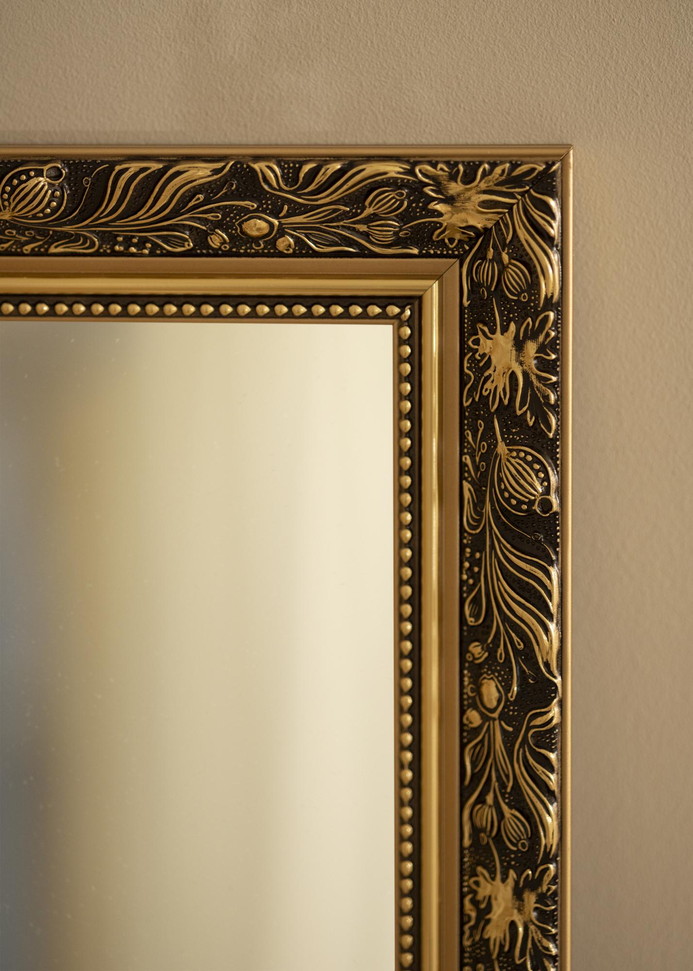 Créez une sensation accueillante et luxueuse là où vous choisissez de placer ce magnifique miroir ! Le miroir a un cadre au design romantique avec un motif à volutes, des bords droits et des rubans de perles à de différents niveaux. La couleur dorée se marie parfaitement avec d'autres détails intérieurs en or, couleurs pastel, noir et blanc !