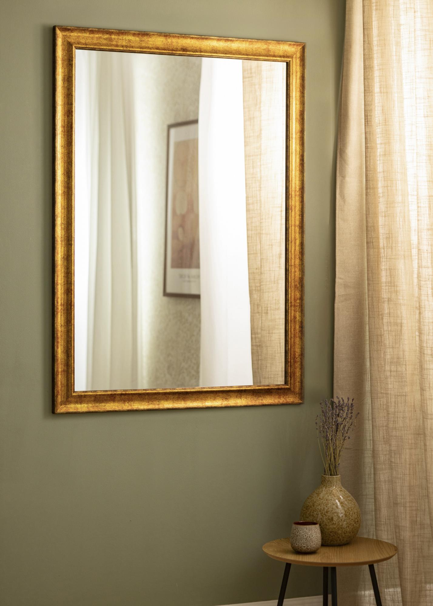 Ce superbe miroir mural est orné d'un cadre doré décoratif en composite. Le cadre a un élégant aspect "vieilli" apportant au miroir une expression plus ancienne qui s'intègrera parfaitement dans les intérieurs chaleureux et accueillants. Les supports muraux pratiques situés à l'arrière du miroir vous permettent d'accrocher le miroir à la verticale comme à l'horizontale. Ce miroir mesure 70x100 cm.