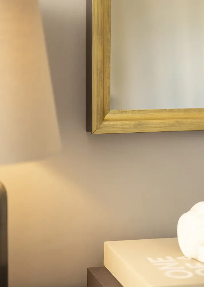 Miroir classique dont vous choisissez la taille du miroir que vous désirez. Avec son profil large et profond, il est assuré d'être un miroir que vous remarquerez. Le miroir a un ton doré doux et agréable qui donne une belle et confortable sensation.