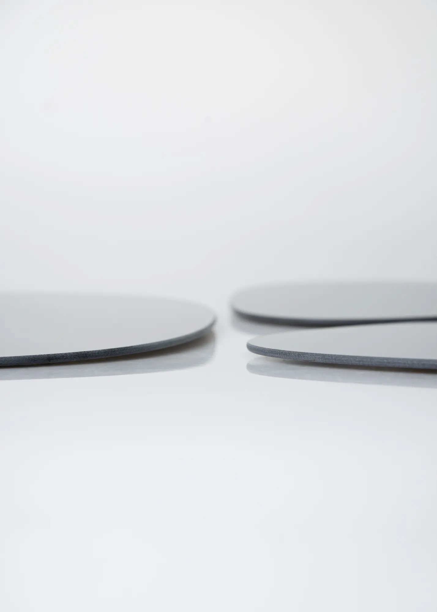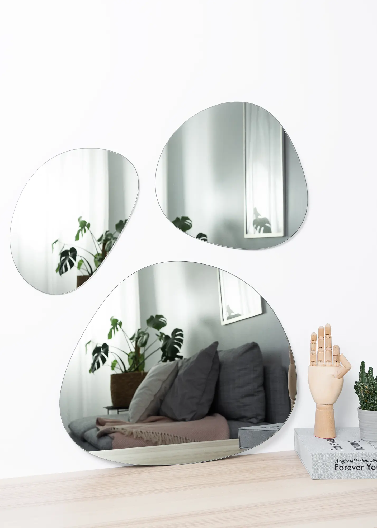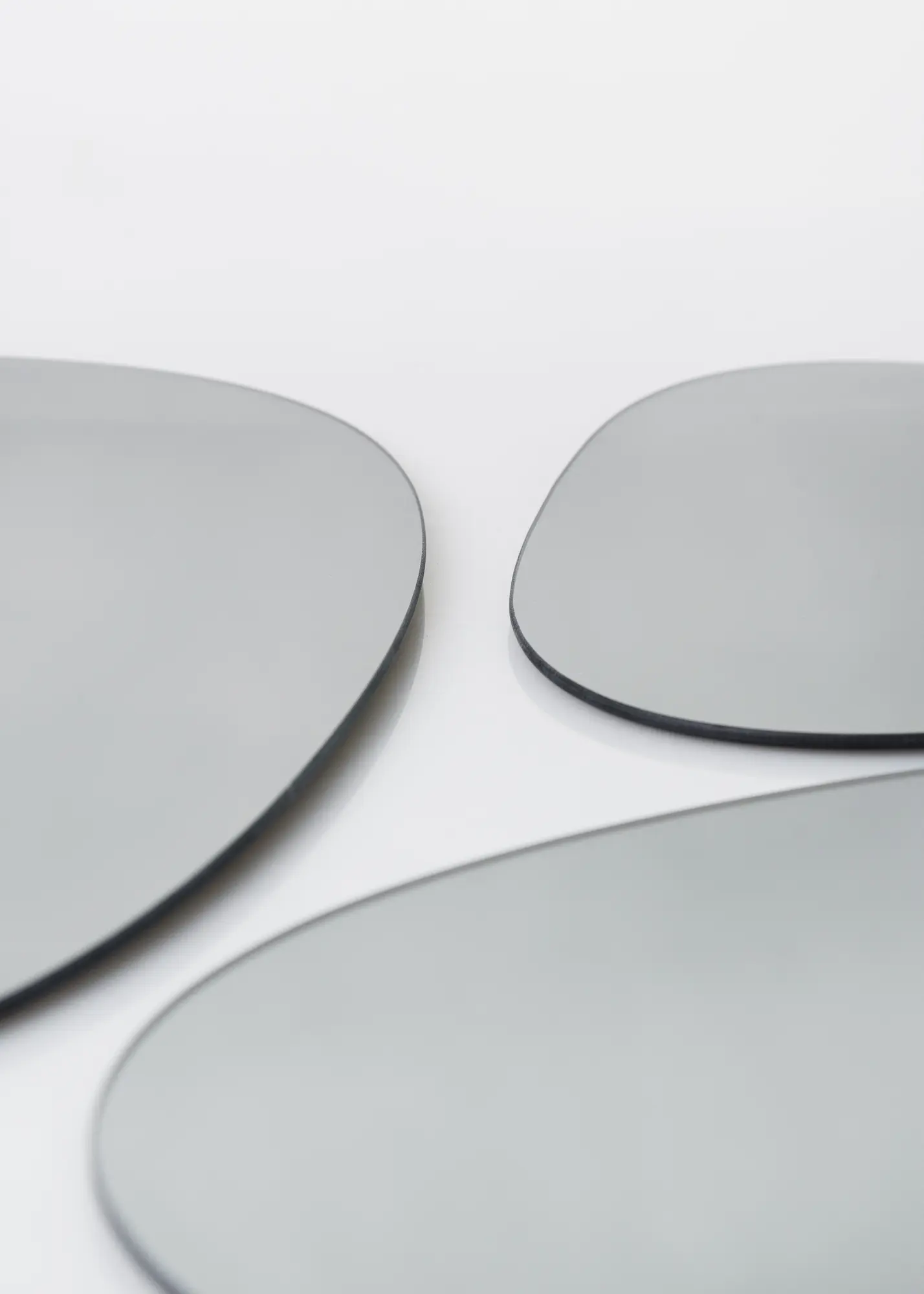 Cet ensemble de miroirs provient du danois Incado et cela signifie qu'il s'agit de miroir de haute qualité et tendance. Le fait que le verre miroir soit teinté dans une couleur d'un gris chaud les rend très plaisant et le design est sympathique avec ces différentes tailles.