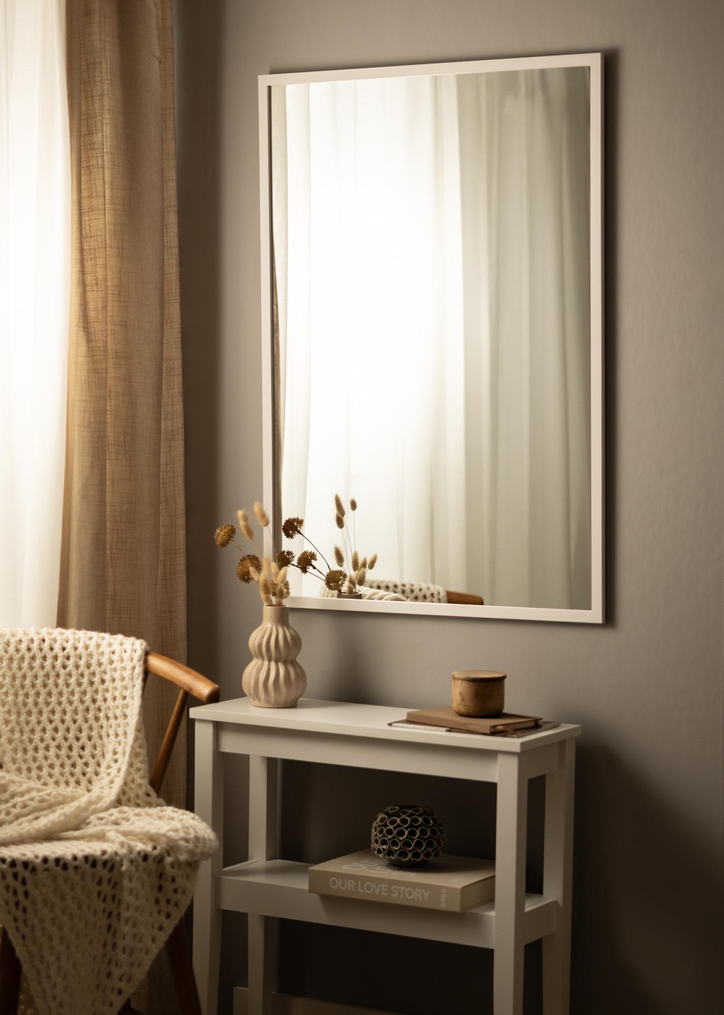 Der Spiegel ist Teil einer Serie von Wandspiegeln in verschiedenen Ausführungen, von denen dieser eine 70x100 cm große Variante mit weißem Rahmen ist.
