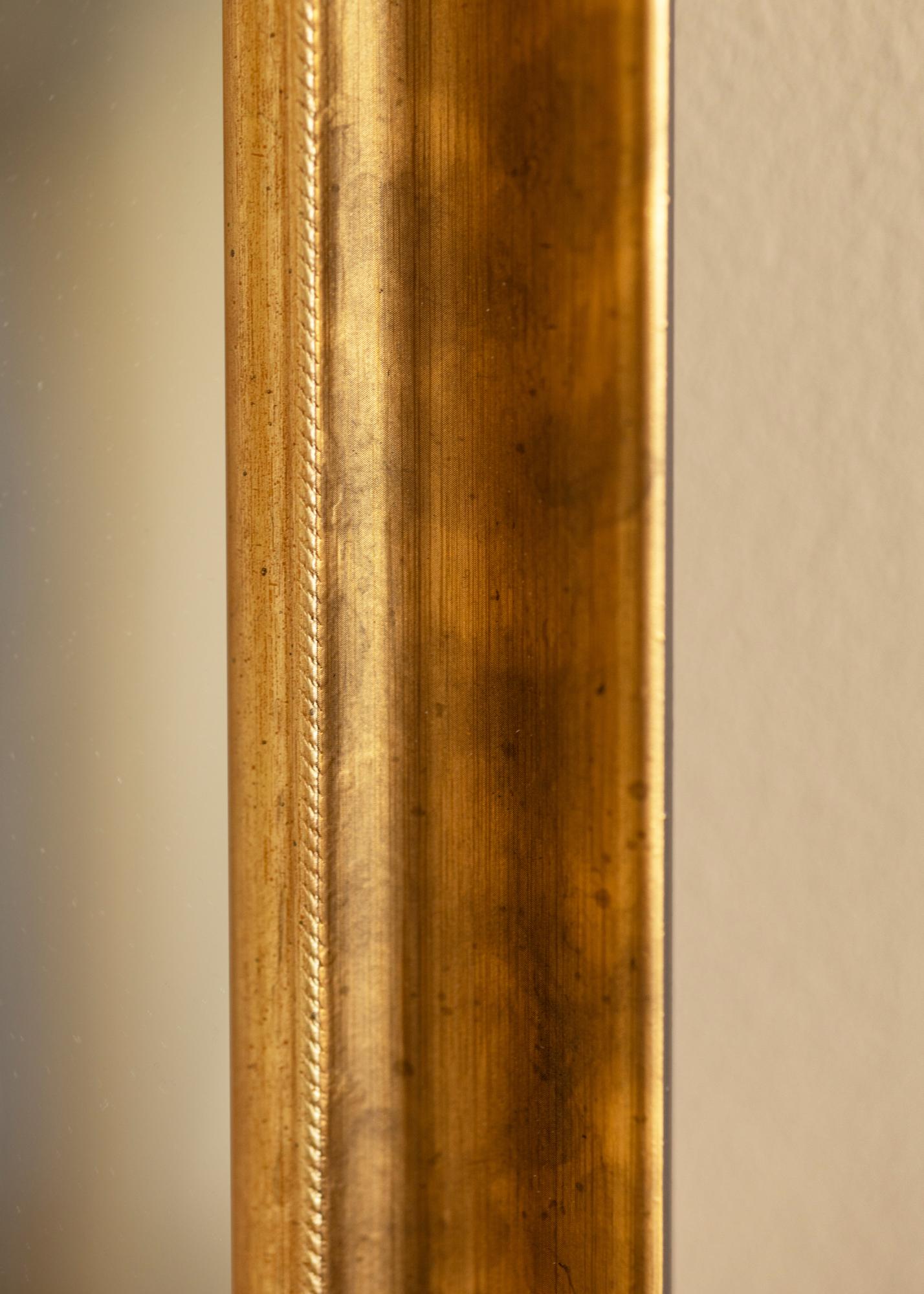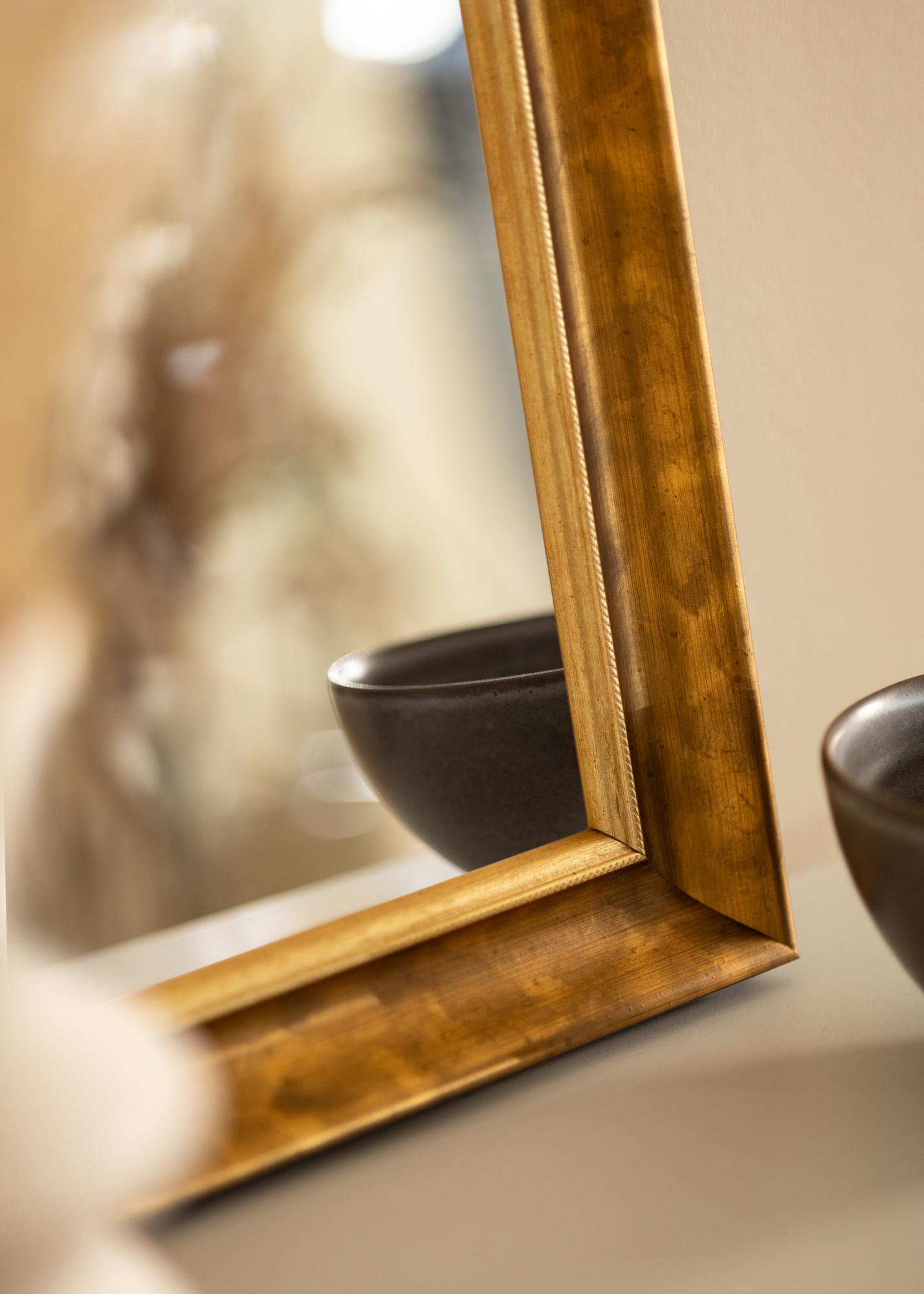 Magnifique miroir dans toutes les tailles avec un superbe profil doré antique avec des éléments en cuivre. Avec son profil large et profond, c'est un miroir qui est assuré d'être remarqué.