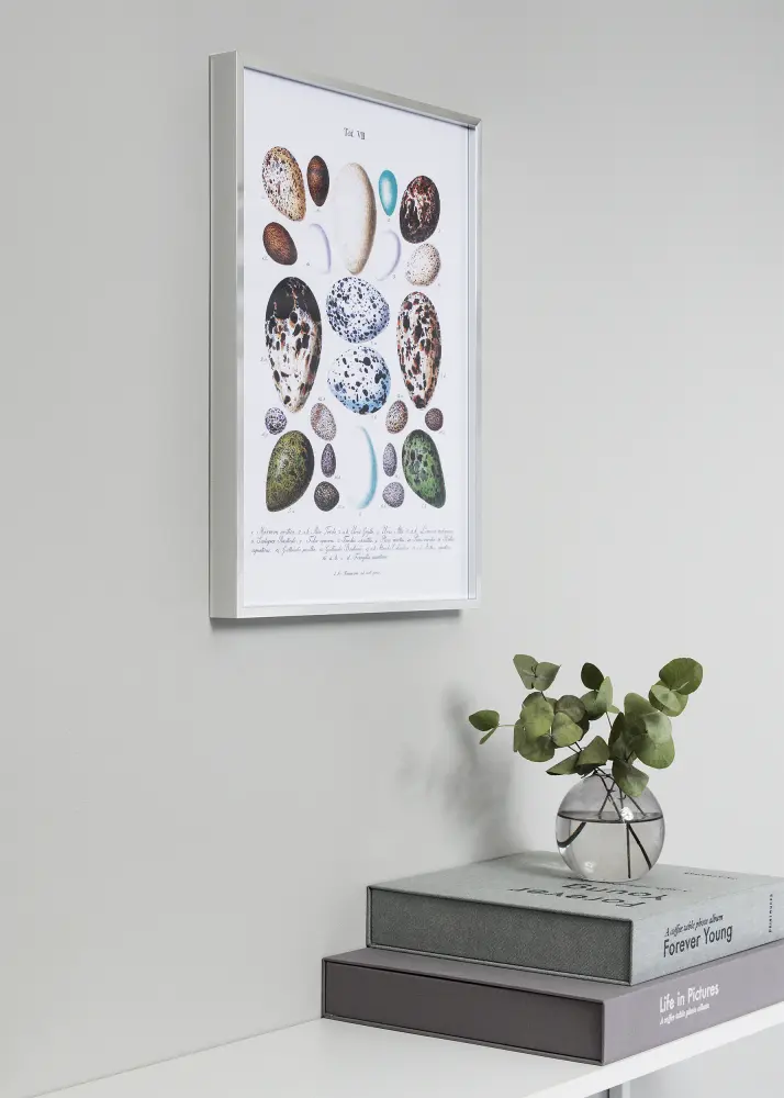 Élégant cadre photo argenté brillant de haute qualité fabriqué en Allemagne, doté d'une baguette d'encadrement fine en aluminium. Le design minimaliste de ce cadre le fait s'intégrer dans un intérieur au style dépouillé et sa discrète couleur gris clair argenté convient tout aussi bien pour encadrer des photographies que des posters. Le grand choix de formats rend ce cadre parfait à utiliser dans un collage de tableaux que vous voulez lier par le choix du modèle de cadre.