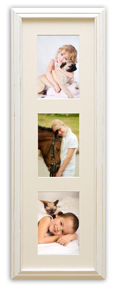 Cadre pour collage avec de la place pour 3 photos. Cadre en bois d'inspiration vintage avec une base blanche et des parties usées sous lesquelles ressort la surface en bois. Cela donne au cadre son caractère particulier.