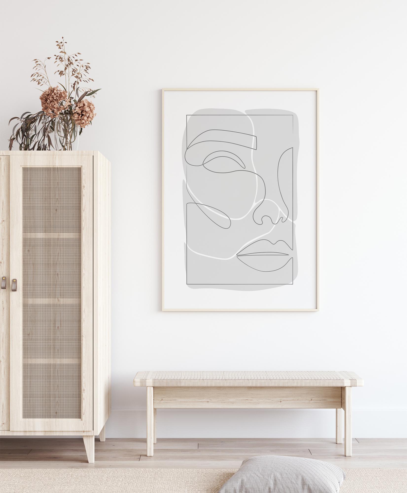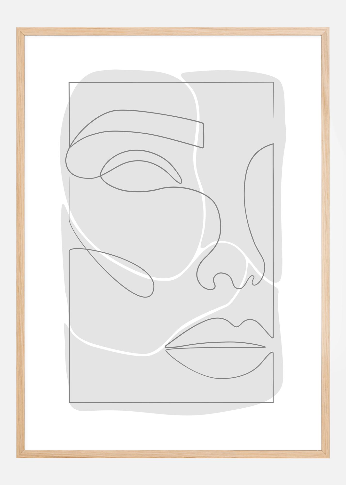 Un beau poster d'un visage féminin. Dessiné sur un fond gris, le dessin d'une seule ligne en noir souligne le nez, les lèvres, les yeux et les sourcils de la femme. Une touche de blanc a été ajoutée en soulignant l'œil et la joue de la femme. Une magnifique affiche pour toutes les femmes.