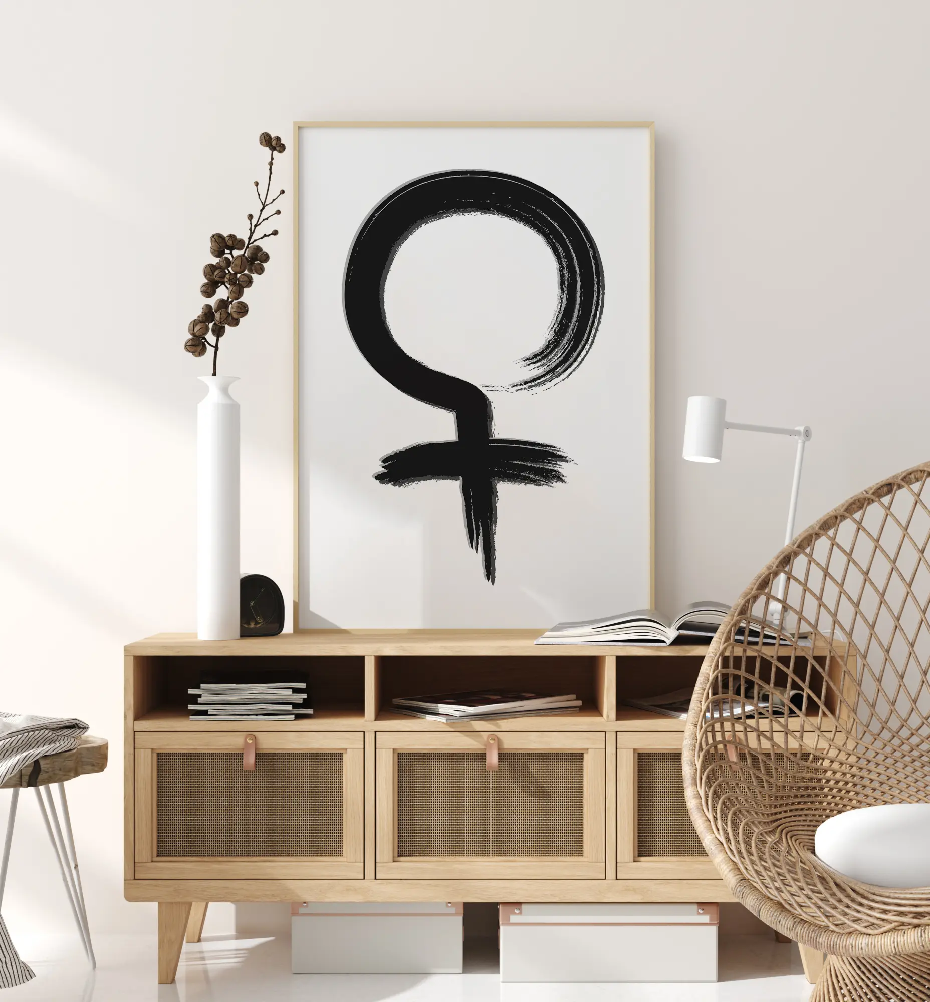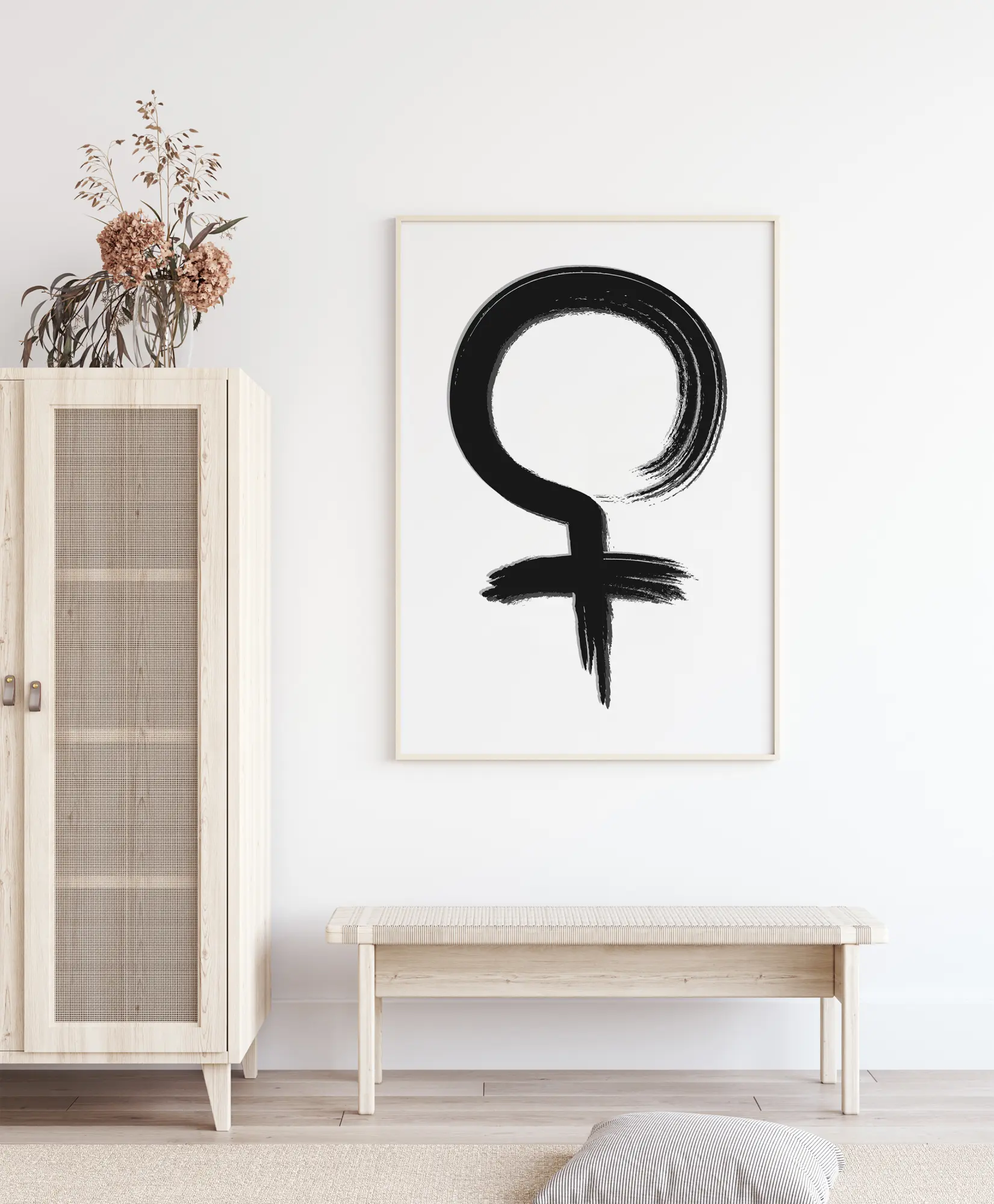Une affiche simple en noir et blanc illustrant le signe du sexe féminin avec un cercle incomplet. Sur un fond blanc, le symbole noir s'estompe vers la fin de l'anneau. Une affiche parfaite à accrocher dans un environnement féminin.
