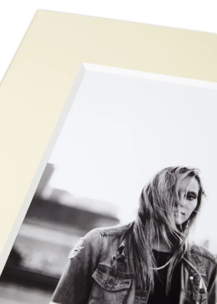 Passe-partoutde couleur crème sans acide et de pH neutre de haute qualité. Son épaisseur de 3 mm donne à vos images une sensation de luxe en 3D.
