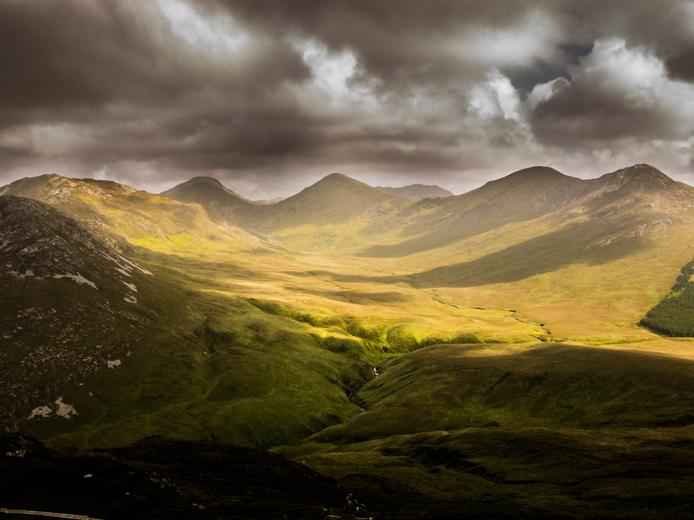 Portrait de paysage dramatique avec des nuages d'orage qui se dressent au-dessus d'une chaîne de montagnes tandis que le soleil illumine la vallée en dessous. Les couleurs sourdes et atténuées soulignent le dramatique de l'image et font que la photographie se démarque vraiment. Convient le mieux dans un cadre qui met en valeur la profondeur de l'image et ne détourne pas l'attention du sujet.