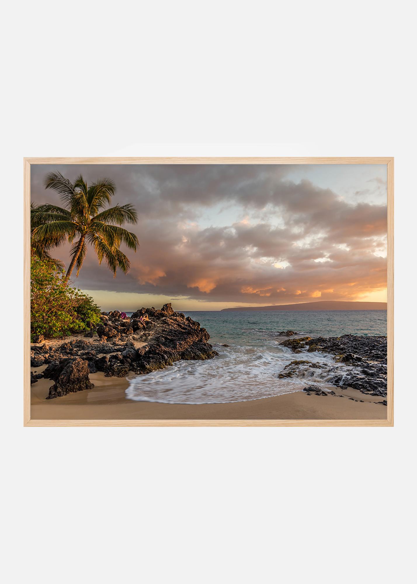 Une plage au coucher du soleil, un beau cliché qui est un must pour le nerd de tiki ou le thème tropical. Poster avec le palmier classique qui se penche sur le bord de la plage dans les derniers rayons dorés du soleil. La photographie est belle dans un cadre avec un aspect vieilli ou dans une couleur vive pour correspondre à la décoration tiki.