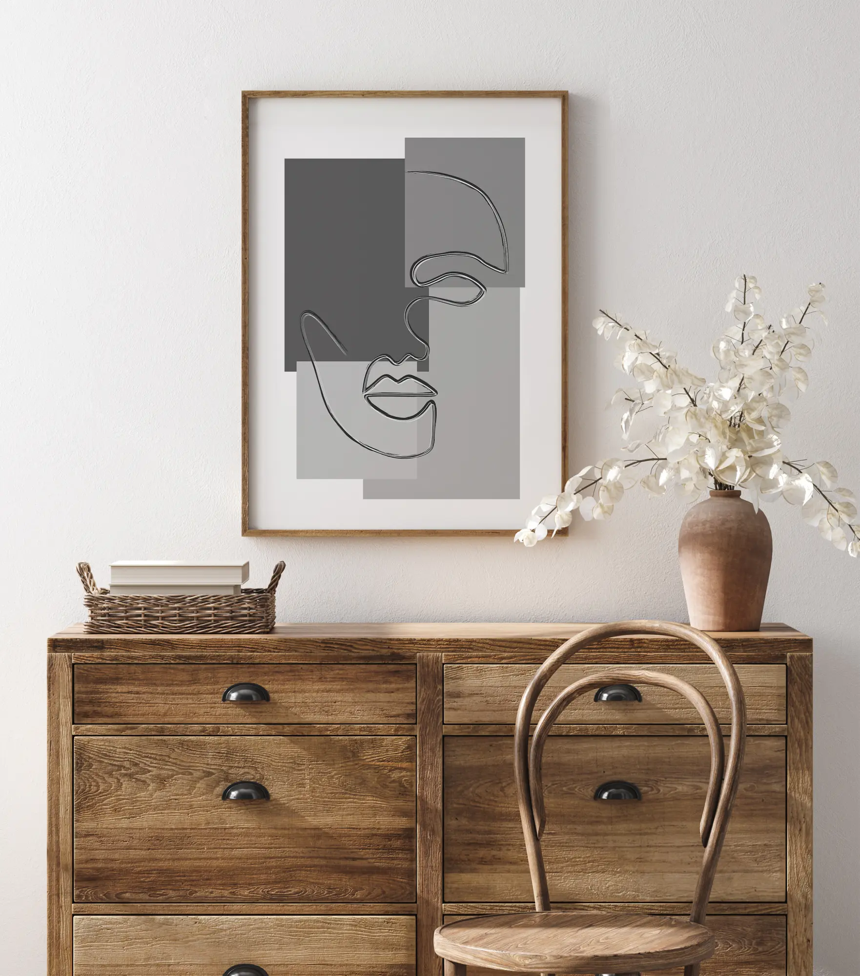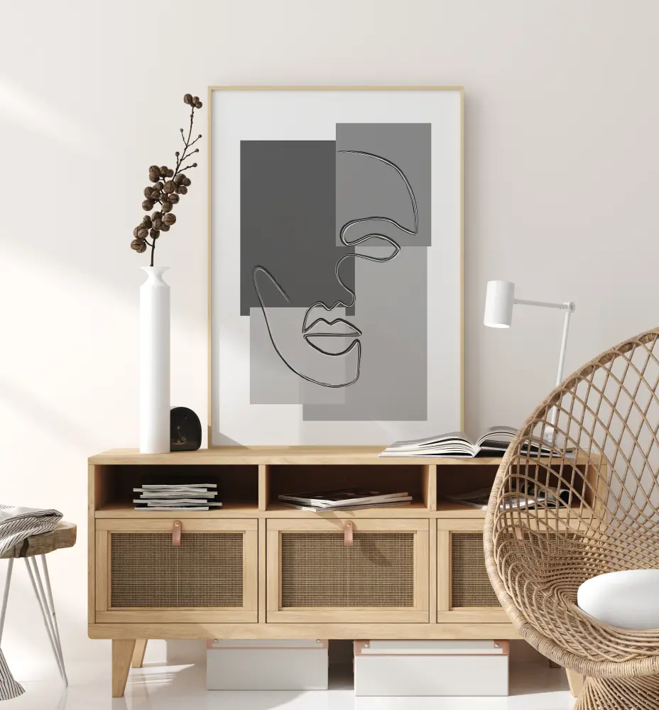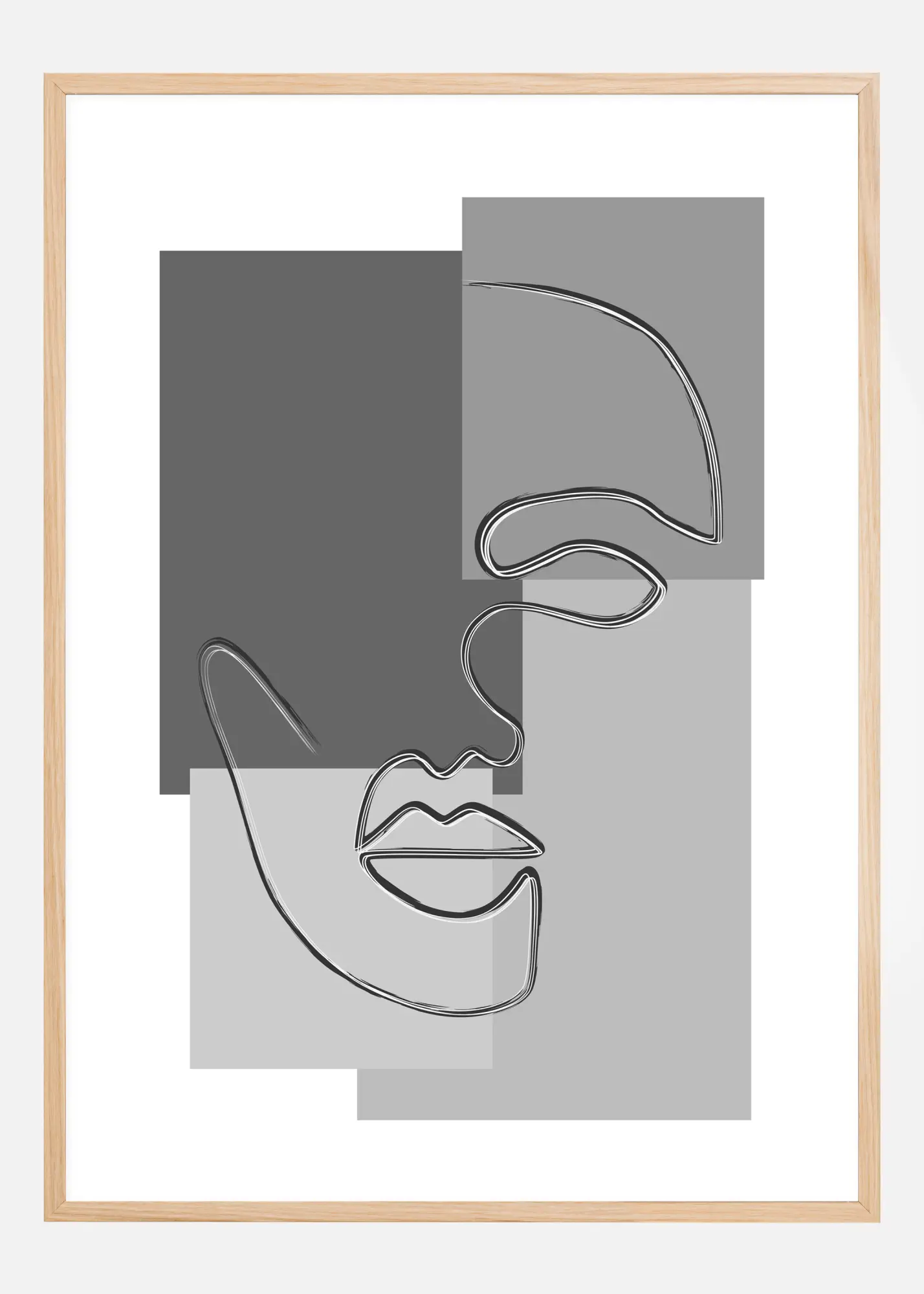 Une affiche abstraite représentant un visage dessiné sur quatre rectangles de couleurs différentes. Une seule ligne fluide dessine le visage, de l'œil au nez en passant par la bouche. Chacun des rectangles arbore un ton gris différent, pour un effet ultra moderne.