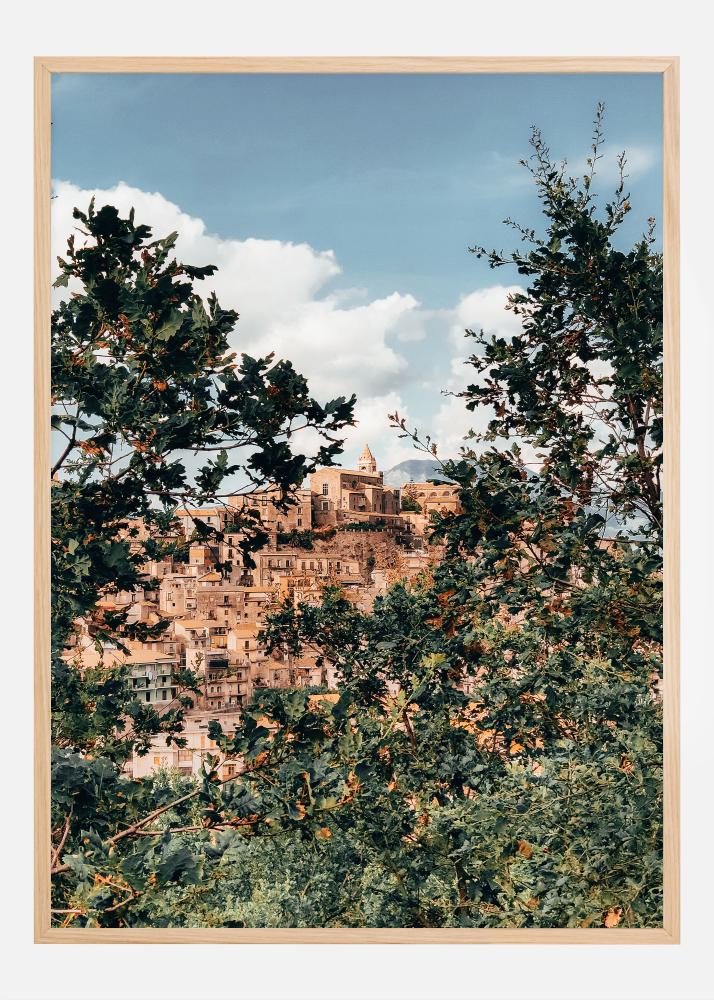 Ce poster riche en détails attire le regard avec une vue vivante d'une ville médiévale grimpant vers un ciel de nuages et de bleu. La ville, située au cœur de la Sicile, est riche en histoire et en culture, ce qui se reflète dans les bâtiments aux tons chauds et les clochers historiques. Entourée de feuillage luxuriant, cette affiche donne l'impression de découvrir un joyau caché, un endroit où chaque pierre et toit a une histoire à raconter.