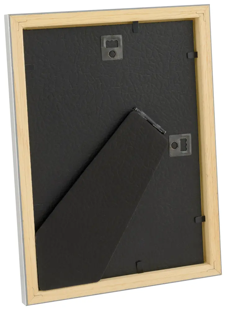 Placez votre photo, votre peinture ou votre poster dans cet élégant cadre ! Ce cadre en bois peint de couleur argentée est doté d'un verre antireflet. Le panneau arrière et le pied sont recouverts de simili cuir noir qui apporte une sensation de luxe supplémentaire.