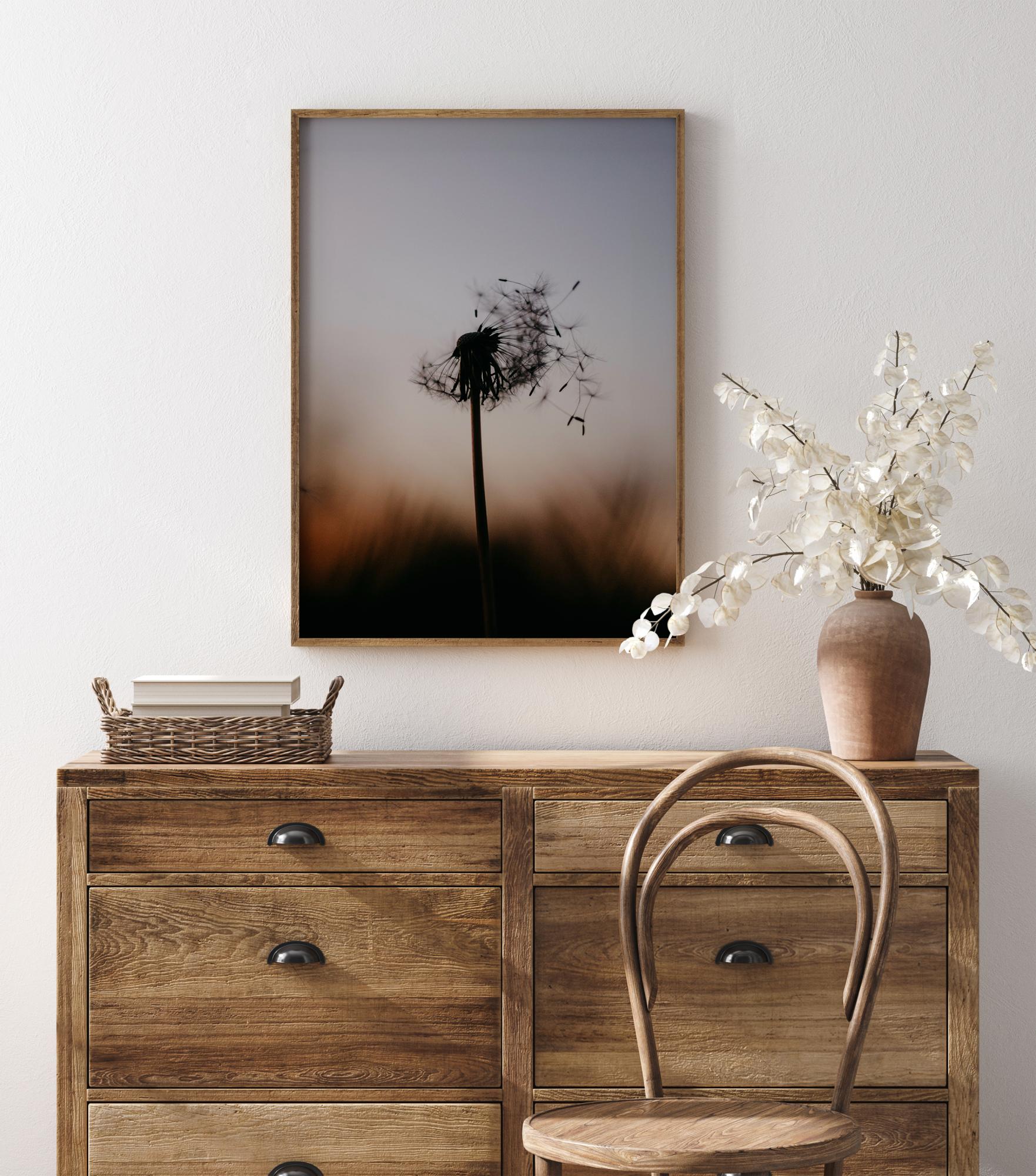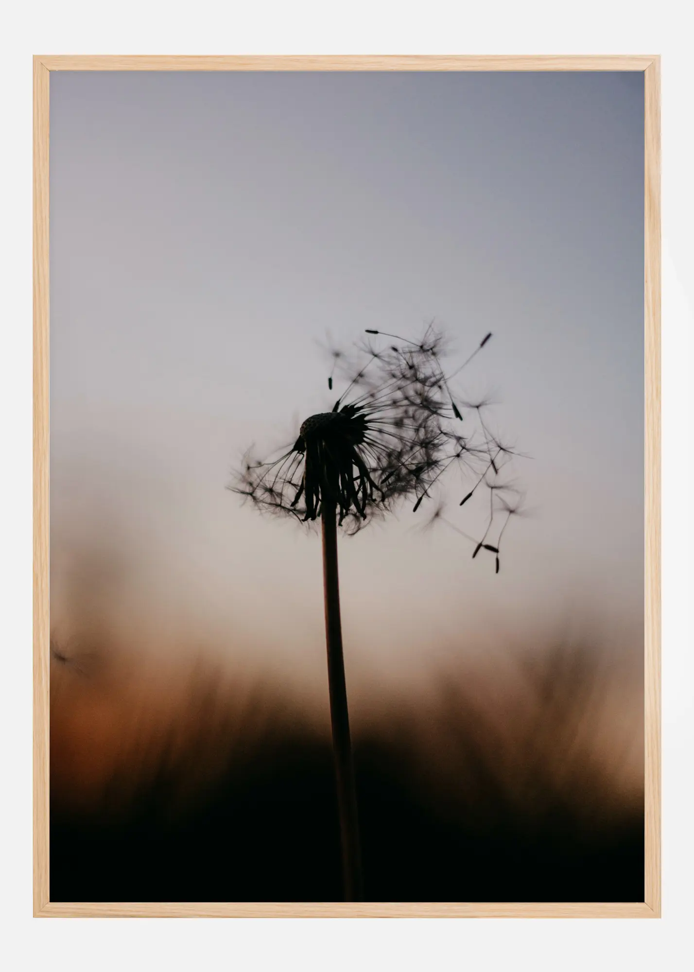 Une affiche élégante d'une fleur de pissenlit dont la moitié des graines ont été soufflées. La silhouette de la fleur est au centre de l'image. Un ciel bleu fait ressortir les graines avec des détails étonnants. L'herbe orange douce au-dessous crée un sentiment de chaleur lorsque la brise souffle.