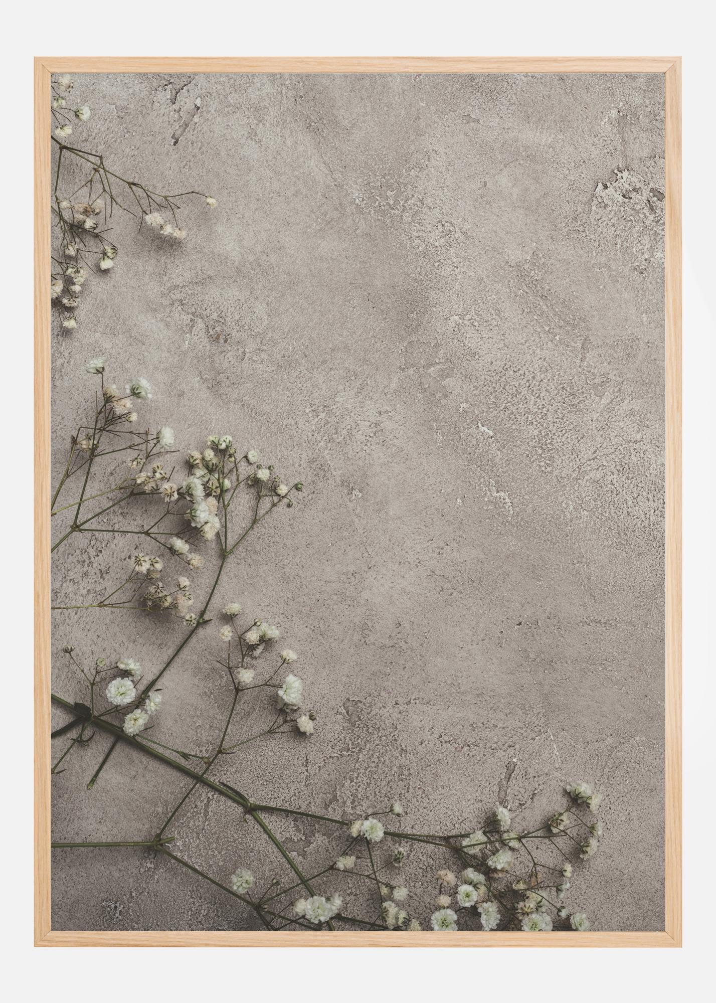 Une affiche nature de tiges de plantes à fleurs éparpillées sur un sol en pierre. Les douces fleurs blanches et leurs tiges ramifiées, plus sombres, s'accordent avec les motifs du sol gris clair texturé. Un mélange d'éléments doux et durs est visible ici, créant cette image intrigante.