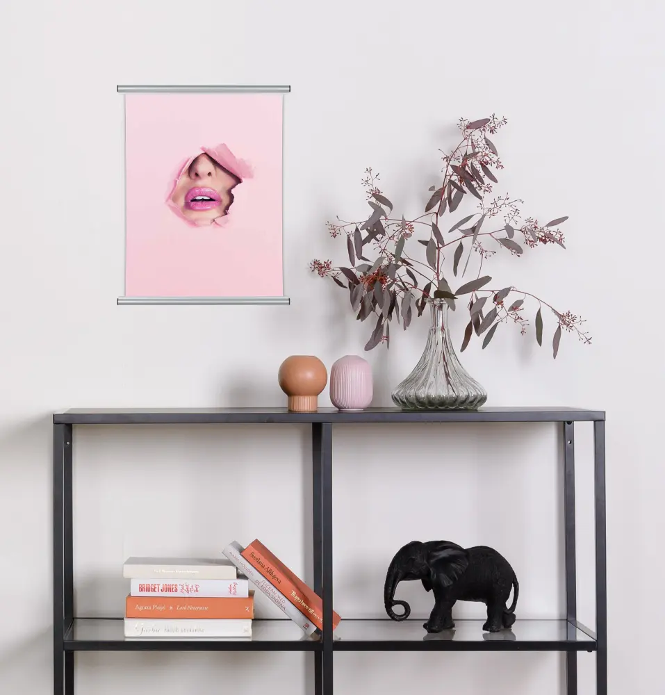 Vous accrochez facilement votre poster entre les deux baguettes du support pour poster à l'aide des aimants associés.